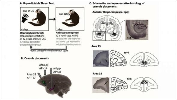 Previous human and animal studies suggest roles for glutamate, the hippocampus, and two prefrontal brain regions — known as area 25 and area 32 — in the behavioral and physiological response to threat. However, the contribution and interaction of these neural components in highly anxious primates is unclear.