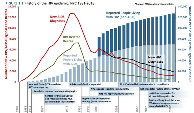 These results were released in the 2018 HIV Surveillance Annual Report that shows that in 2018 there were 1,917 new cases of HIV in New York City in 2018. In 2017 there had been 2,157 new cases. Thus the decline from 2017 was 11 percent and the decline from 2001 since the survey began was 67 percent says the report (over 4,000 cases had been reported in 2001).