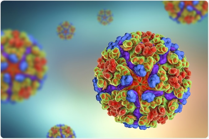 Chikungunya virus, 3D illustration. Emerging mosquito-borne RNA virus from Togaviridae family that can cause outbreaks of a debilitating arthritis-like disease. Illustration Credit: Kateryna Kon / Shutterstock