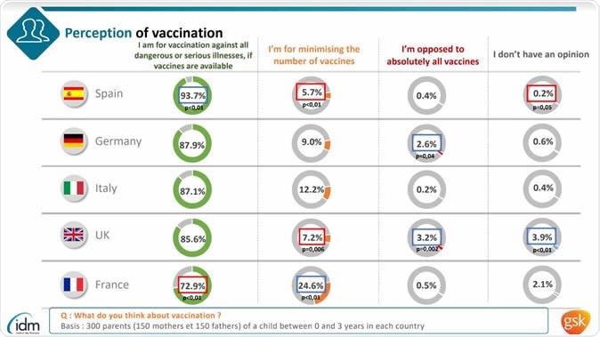 Now, Alain Martinot from Lille Hospital in France and colleagues have compared parents' opinions about vaccines across five European countries, namely France, Germany, Italy, Spain, and United-Kingdom. The Vaccinoscopie survey was filled out by 1,500 people  –  300 from each country – who were parents to infants aged between 0 years and 35 months.