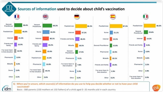 The most common information source that decisions to vaccinate were based on was a GP or pediatrician consultation (ranged by country from 50% to 87%), followed by the internet (14% to 40%, depending on the countries' healthcare systems) and friends and family (9% to 30%.)