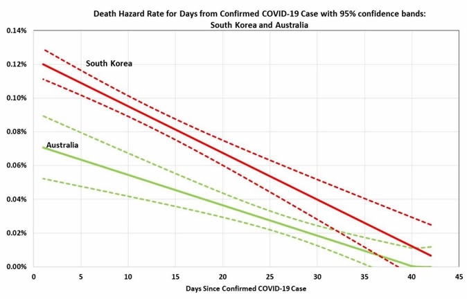 The researchers conclude that daily death hazard rates will also be higher in South Korea than in Australia. When they applied the age-specific CFRs from South Korea to the age-stratified Australian case count, they arrived at a prediction of 265 deaths. The aggregate CFR for Australia, in this case, is 2.6%.