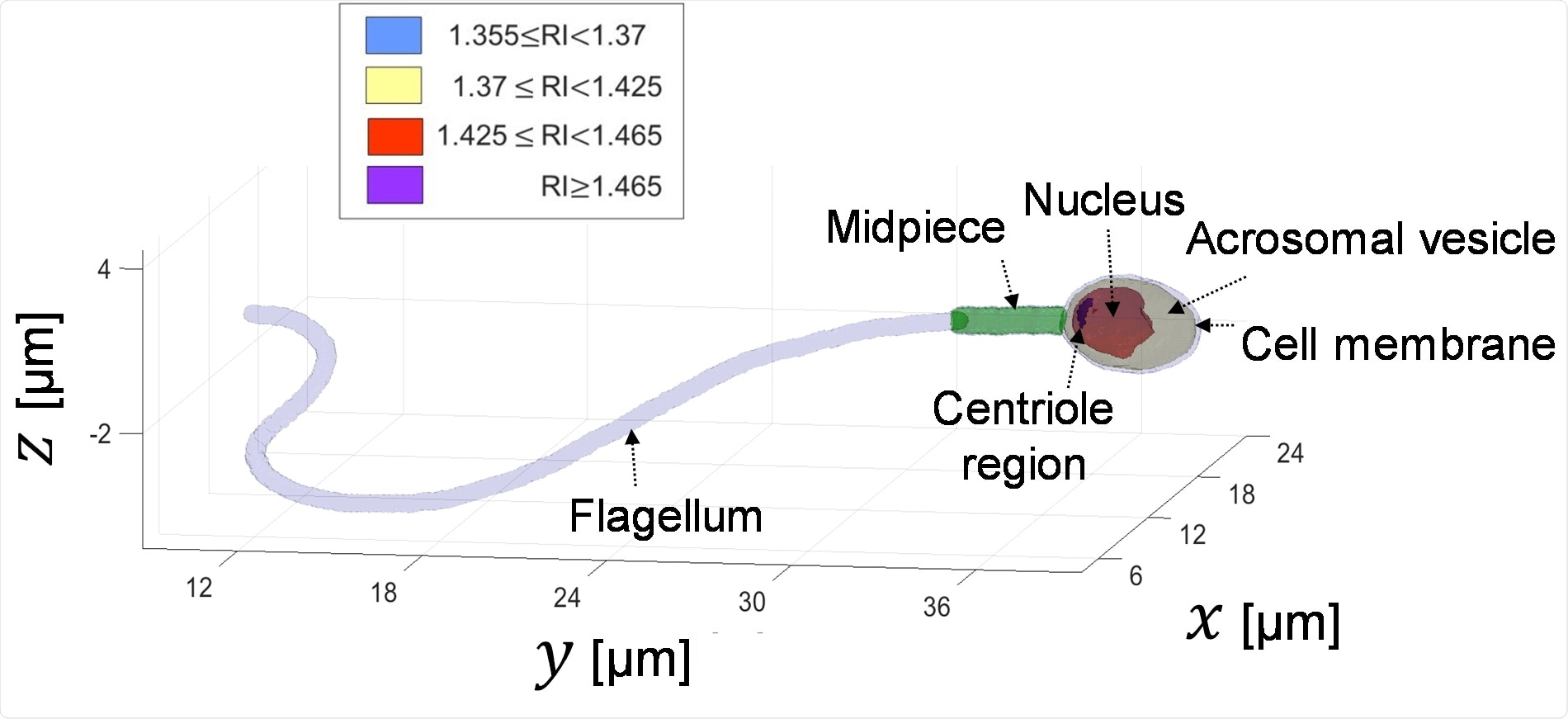 Visualization of the inner organelles of the sperm cell, which can be discriminated by the values of their refractive index (RI). This is done during the sperm swim and without staining it.