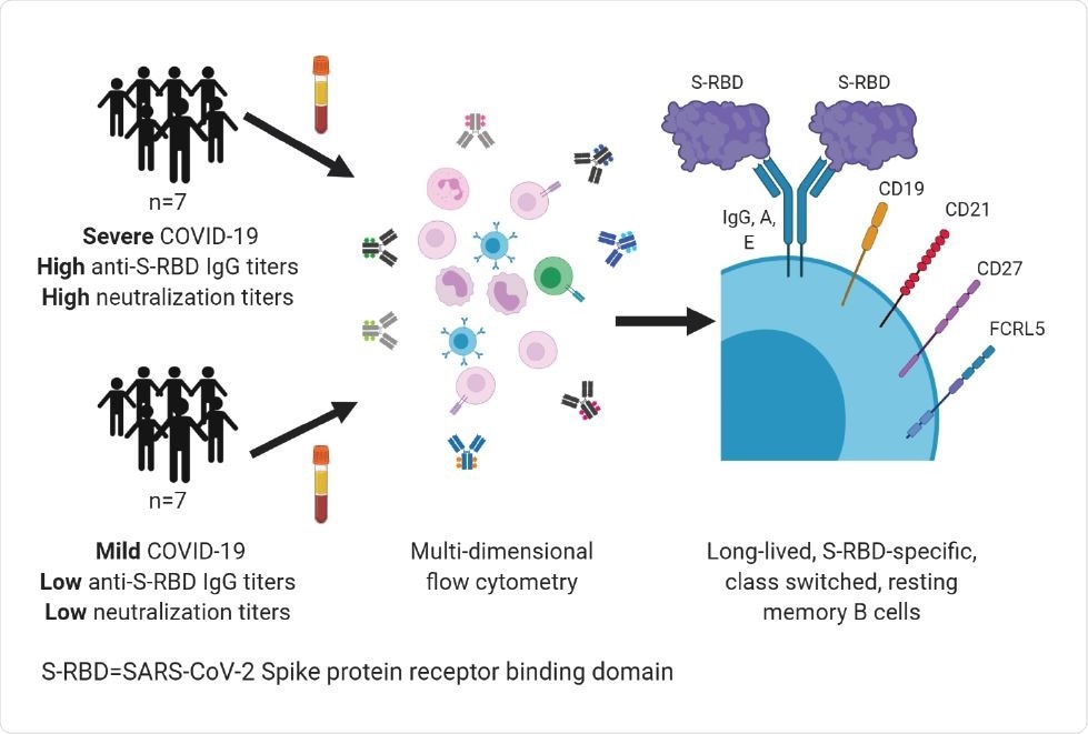 They performed a multi-dimensional flow cytometric analysis of memory B cells specific to the S-RBD. Their study cohorts comprised ambulatory COVID-19 patients who had a mild disease as well as hospitalized COVID-19 patients with moderate or severe disease. The analyses were performed at a median of 54 (39-104) days following the onset of symptoms.