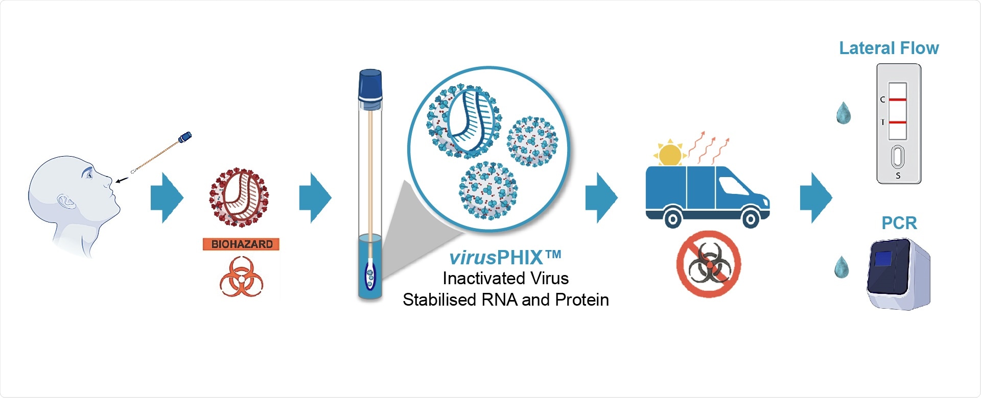 RNAssist and Rapid Labs have developed virusPHIX-P9™ as a universal Virus Transport Media (VTM) specifically for the safe transport of clinical swab and saliva samples to testing labs as well as for EQAs and molecular controls. virusPHIX-P9™ is the only VTM that inactivates virus and stabilizes nucleic acid, which can also be used directly for Lateral Flow and PCR tests. More information can be found https://www.rapidlabs.co.uk/.
