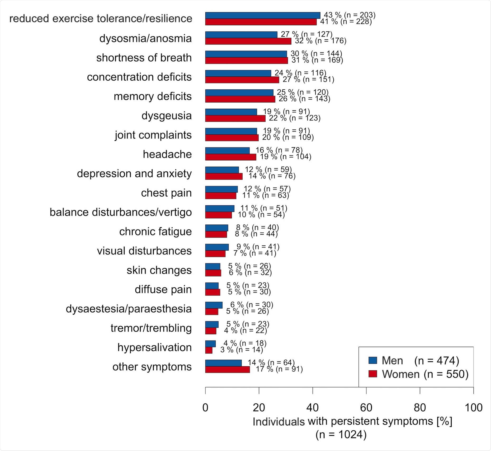 An estimated 43 percent of women and 32 percent of men reported at least one persistent symptom months after their acute infection. The number of symptoms per individual was higher in women. Further, pre-existing mental health conditions and cardiovascular risk factors increased the risk of post-COVID-19 syndrome in women but not in men.