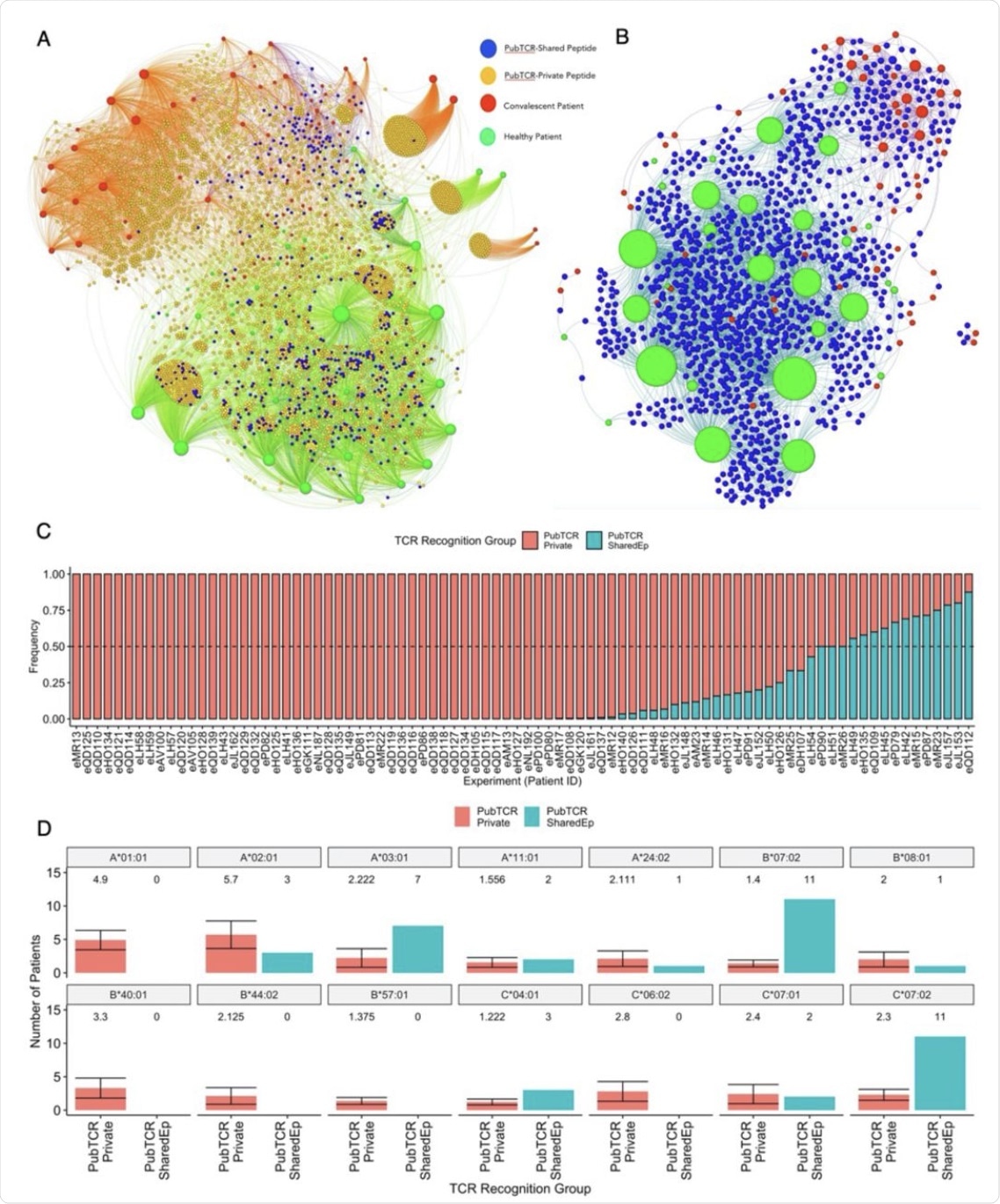 Graphing their interactions showed two clear hubs, with healthy people being connected to public TCRs recognizing shared peptides or SARS-CoV-2 peptides (mostly the former) on one hub. The second hub, representing convalescent COVID-19 patients, showed mostly public TCR repertoires with their cognate SARS-CoV-2-private peptides.