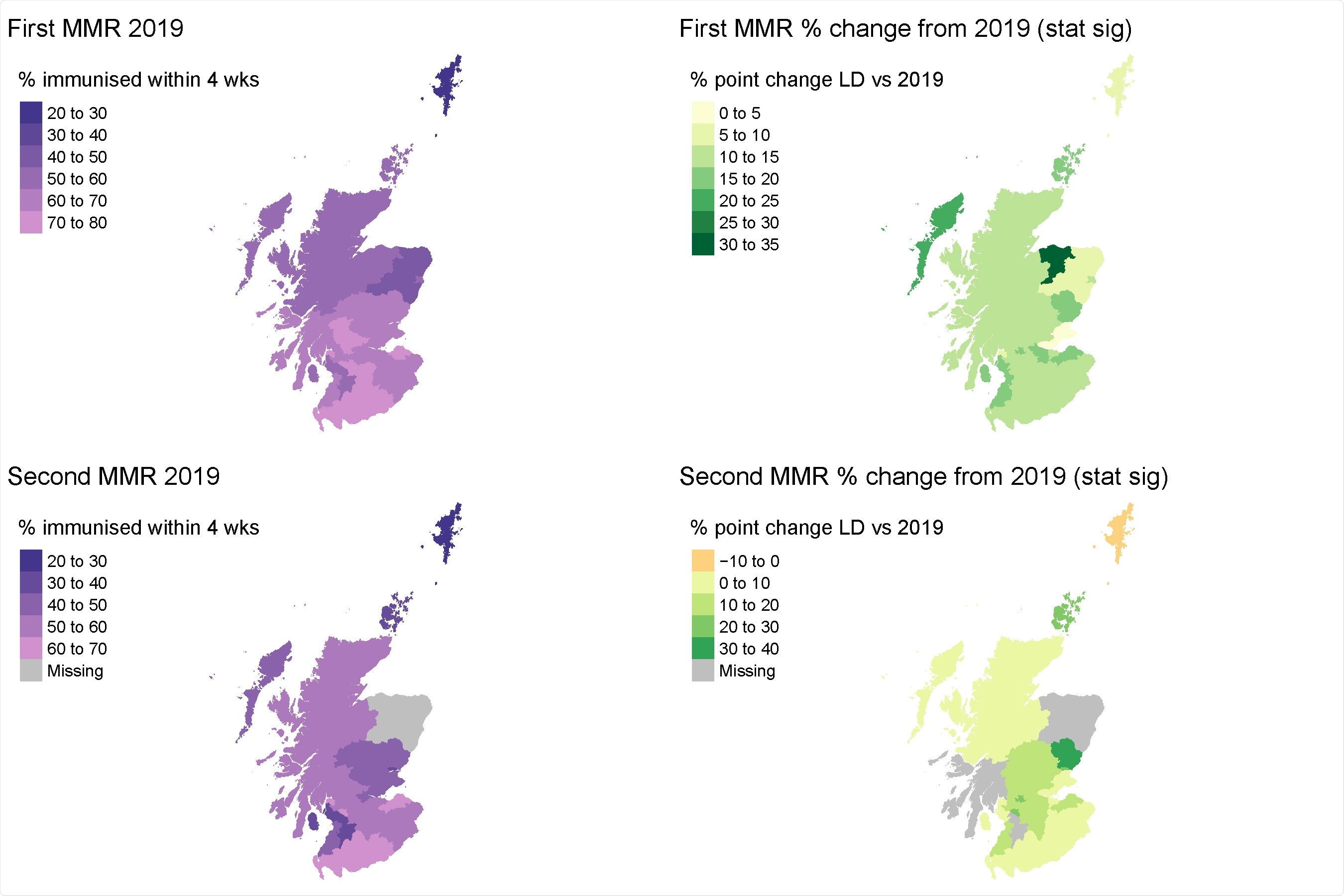 The improvement is seen to be due to a significant rise in 8/31 HSCPs, mostly in the thickly populated urbanized central region of Scotland. However, a rise in MMR uptake was seen to occur with both doses, at up to 30% of 2019 values.