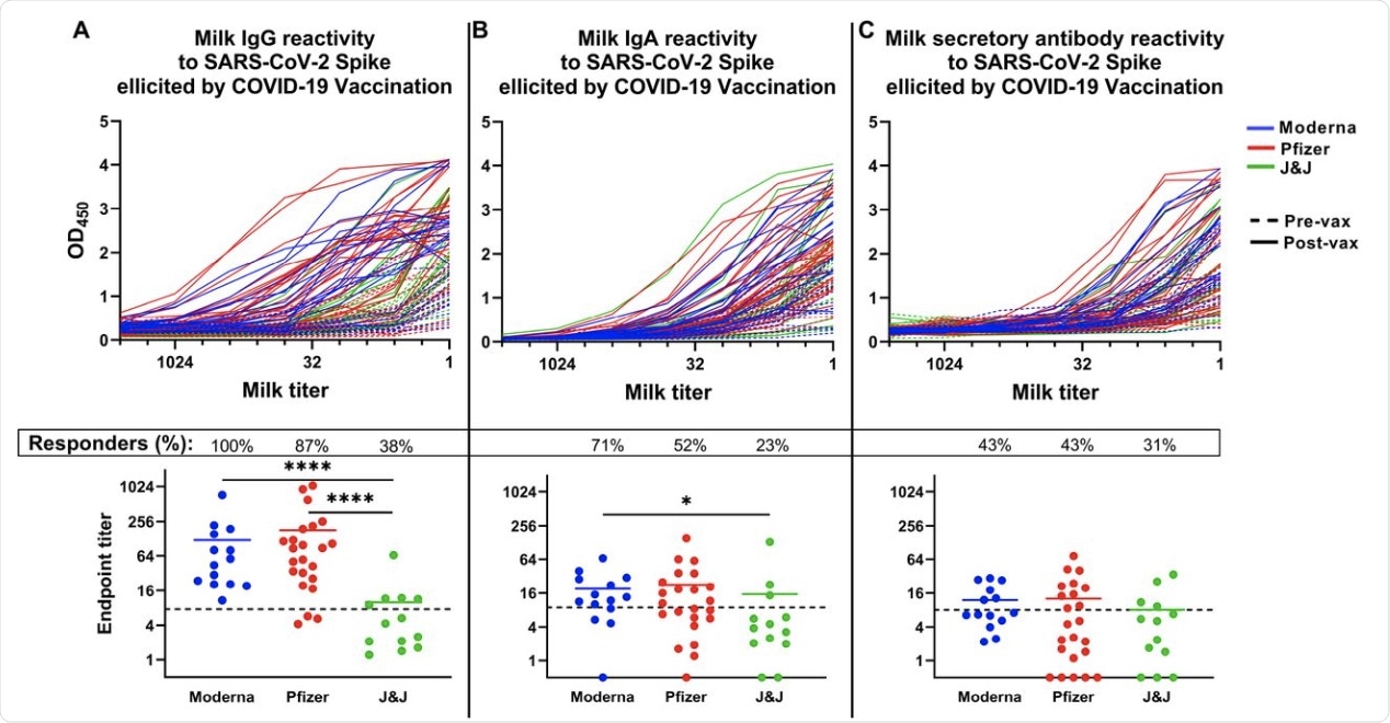 About 70% and 50% of samples from Moderna and Pfizer vaccine recipients, respectively, had spike-targeting IgA in the milk, with not much difference in titer values. Moreover, the Moderna vaccine elicited a higher increase in secretory IgA at 93%, which is comparable to about 74% and 54% with the Pfizer and J&J vaccines, respectively. Overall, the level of secretory antibodies induced by vaccination was low with all vaccines, whether measured in absolute terms or compared to post-infection titers.