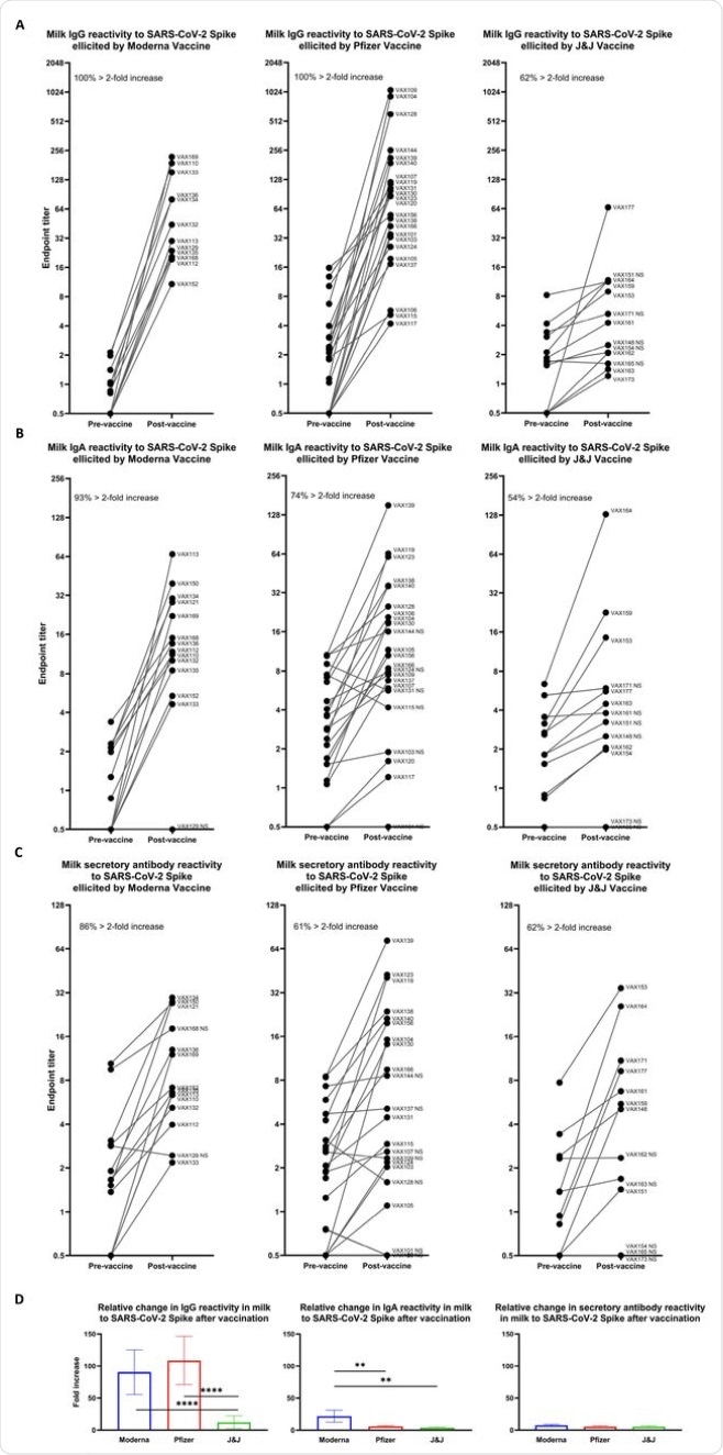Relative increases in milk antibody reactivity to SARS-CoV-2 Spike elicited by COVID-19 vaccination. Endpoint titers were determined as in Fig. 1 for pairs of milk samples obtained from participants within 1 week before and 14 (Pfizer/Moderna) or 28 (J&J) days after completion of a vaccine regimen. Pre-vaccine and post-vaccine endpoint titers are shown for: (A) IgG reactivity. (B) IgA reactivity. (C) Secretory antibody reactivity. Left panel, Moderna vaccine; center panel, Pfizer vaccine; right panel, J&J vaccine. Each plot indicates the percent of vaccine recipients exhibiting > 2-fold increase in specific endpoint titer between pre- and post-vaccine milk samples. (D) Fold increases in endpoint titers are shown for each vaccine group as indicated. ****p<0.0001; **0.0001<p<0.009. Mean values with SEM are shown.