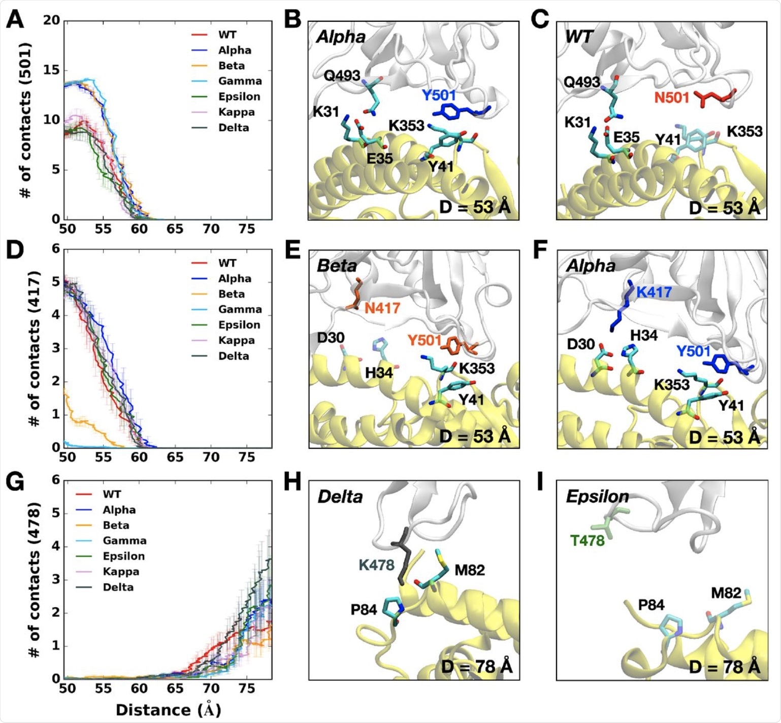 In particular, the Alpha variant’s Y501 was closer to the Y41 and K353 residues on the ACE2 protein. Again, the RBD of the Alpha variant has the most contact with the N90 glycan residue on the ACE2 and, as a result, its rapid rise to dominance.
