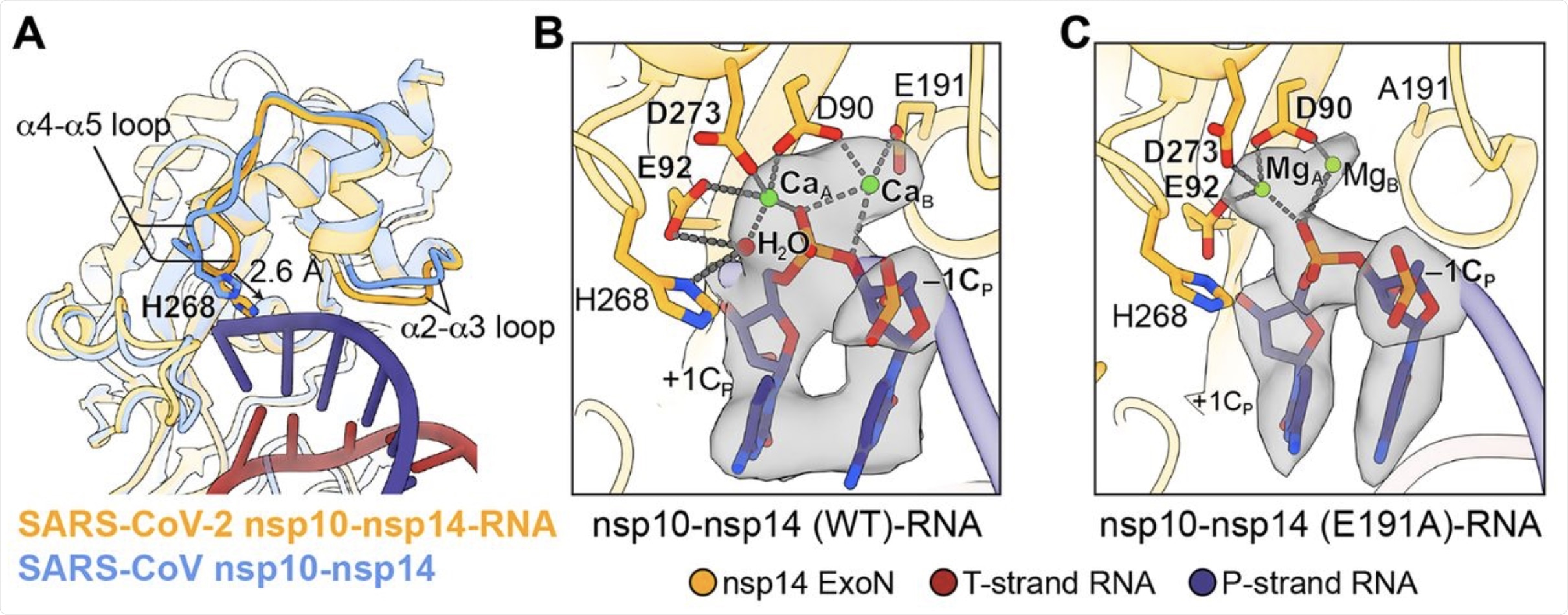 The investigators found that the binding of the RNA substrate to the ExoN active site of the SARS-CoV-2 wildtype (WT) nsp10-nsp14-RNA complex causes two metal ions to bind to the catalytic center. This triggers further reactions that complete the active site.