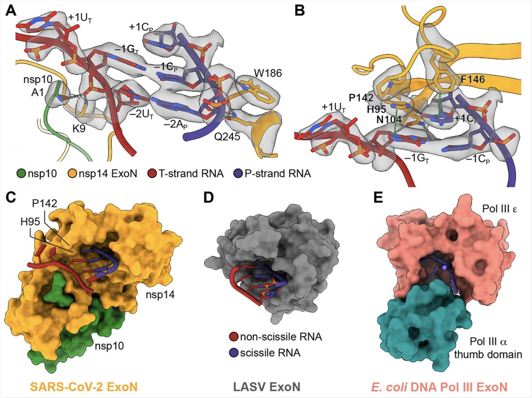 Using a combination of size-exclusion chromatography (SEC), single-particle cryo-electron microscopy (EM), and in silico methods, the researchers found that the nsp10-nsp14-RNA complex binds also to nsp8, though in a weak and dynamic manner. This binding promotes stable RNA substrate binding that allows for RNA cleavage by ExoN. It also increases RNA degradation by the nsp10-nsp14 complex.