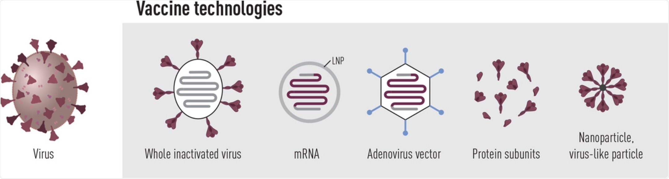 Vaccine platforms in use or under clinical evaluation to prevent COVID-19. Currently, several inactivated whole virus vaccines as well as SARS-CoV-2 spike-encoding vaccines based on mRNA or adenovirus technology are approved for clinical use. Furthermore, spike protein subunit vaccines have shown high efficacy in phase 3 clinical trials and should be approved for use shortly.