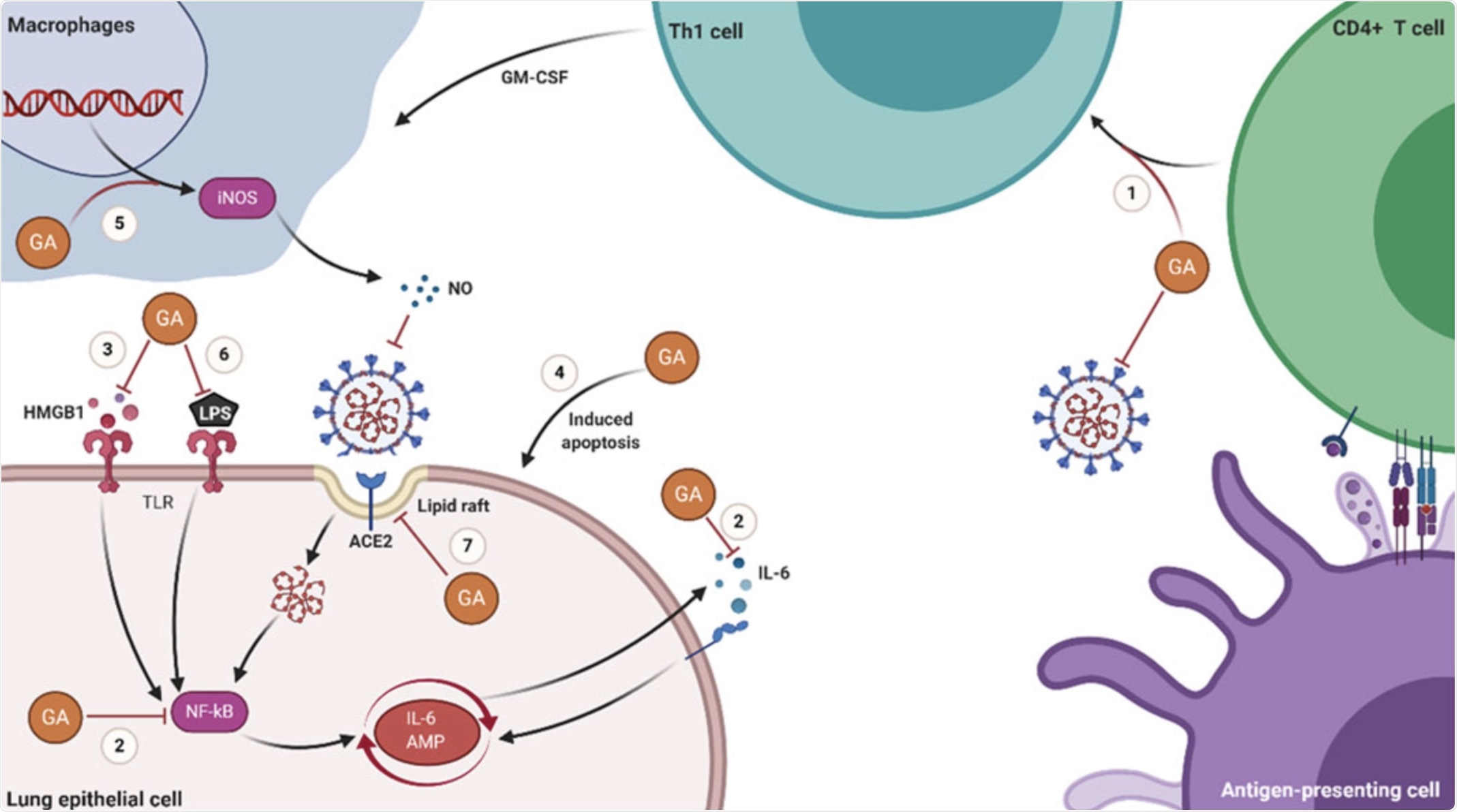 GA has been used in TCM for a long time as an antiviral and anti-inflammatory compound. Recent research shows its ability to suppress SARS-CoV-2 invasion and replication.