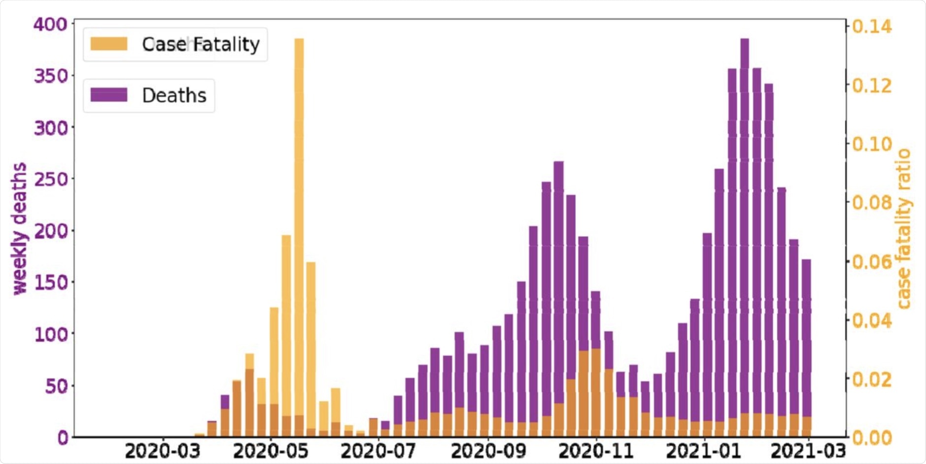 Case-fatality rates in Israel quickly rose during the start of the pandemic and peaked in May 2020.