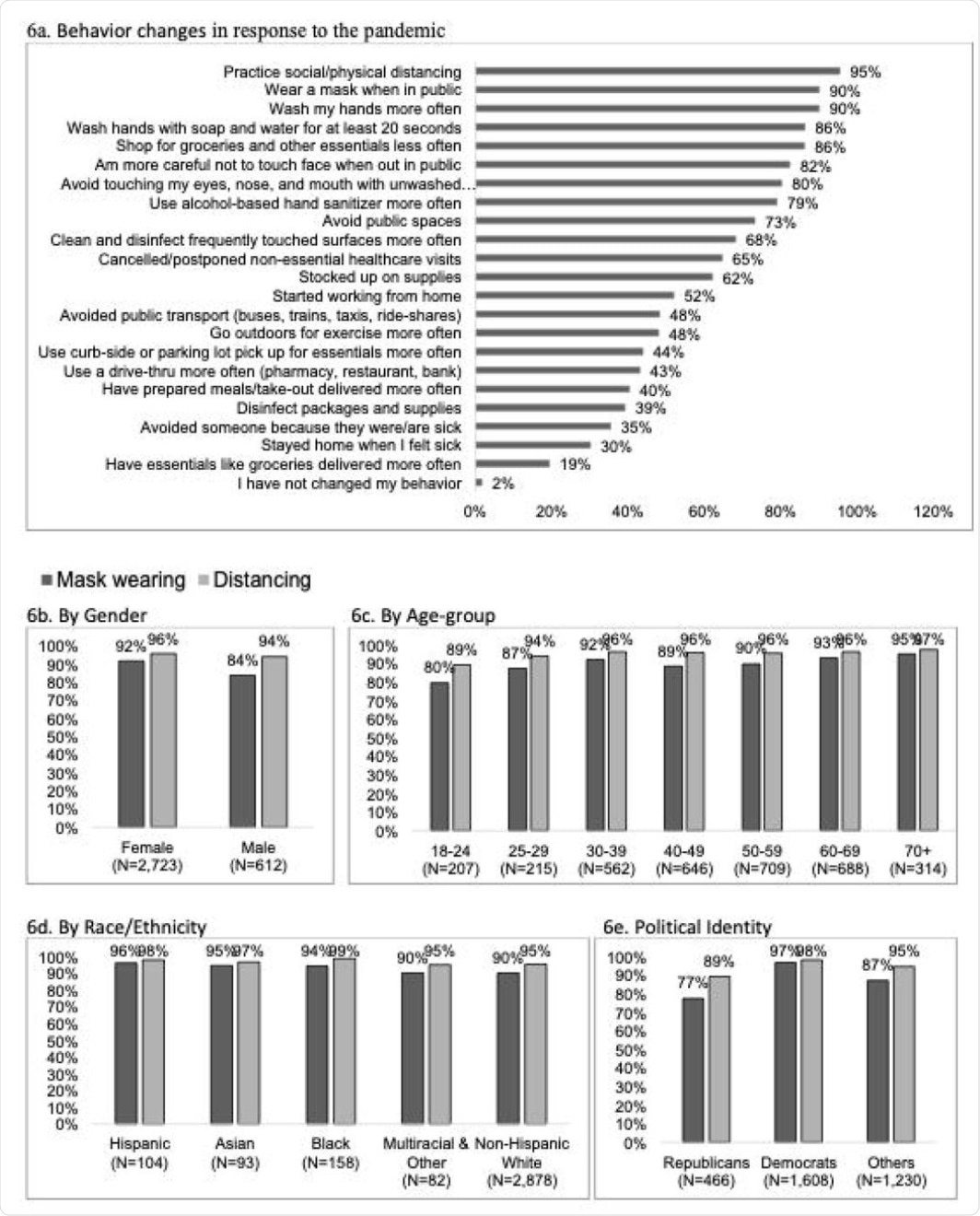Survey responses to the question: “How (if at all) have you changed your behavior in response to the coronavirus/COVID-19? (Check all that apply)” for all respondents (6a). Percent of respondents reporting mask wearing and distancing by gender (6b), age-group (6c), race/ethnicity (6d), political identity (6e), education level (6f), income level (6g), and Virginia region (6h). Percent of respondents reporting an information source as trustworthy by if they reported wearing or not wearing a mask in public (6i) and by distancing or not distancing in public (6j).