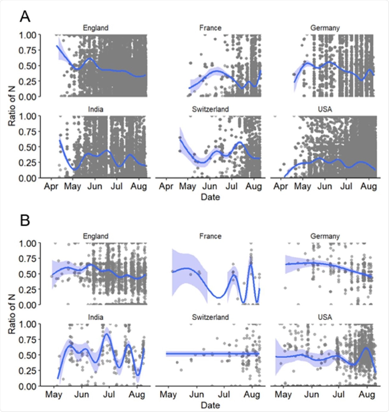 Ratio of number of Ns present in the ROI to the total number of Ns present in the entire genome of SARS-CoV-2 sequences for six countries in 2021. Considered here are A) all sequences with a total <5% of Ns and B) those with N-containing segments of length > 200 nt. The dark blue lines depict the best fitting lines of generalized additive models (GAM) with 95% confidence intervals (light blue areas).