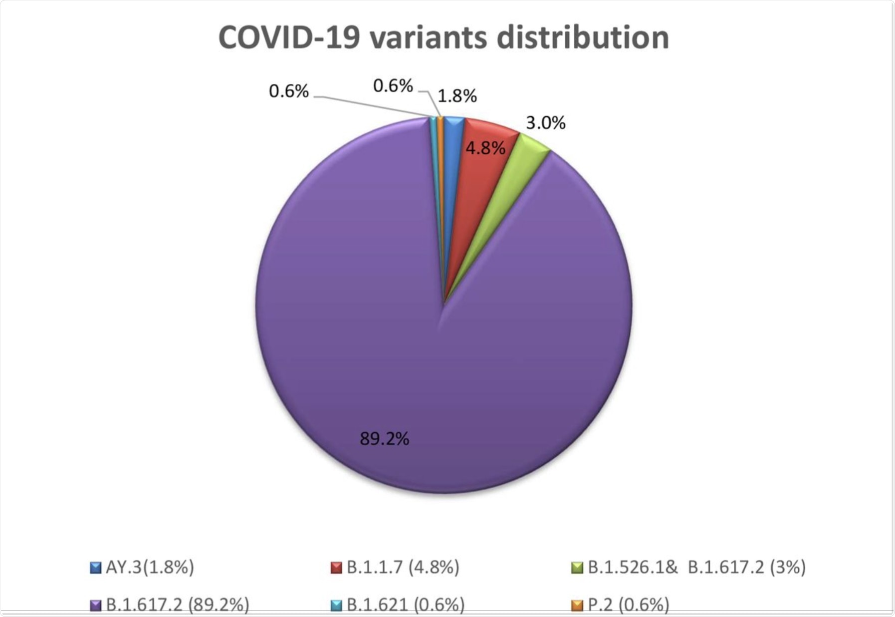 Of all COVID-19 variants analyzed, 89.2% of the samples were found to contain genetic material from the B.1.617.2 variant. This was followed by the B.1.1.7 (4.8%) variant and a combination of the B.1.526.1 and B.1.617.2 (3%), AY.3 (1.8%), B.1.621 (0.6%), and P.2 (0.6%) variants.