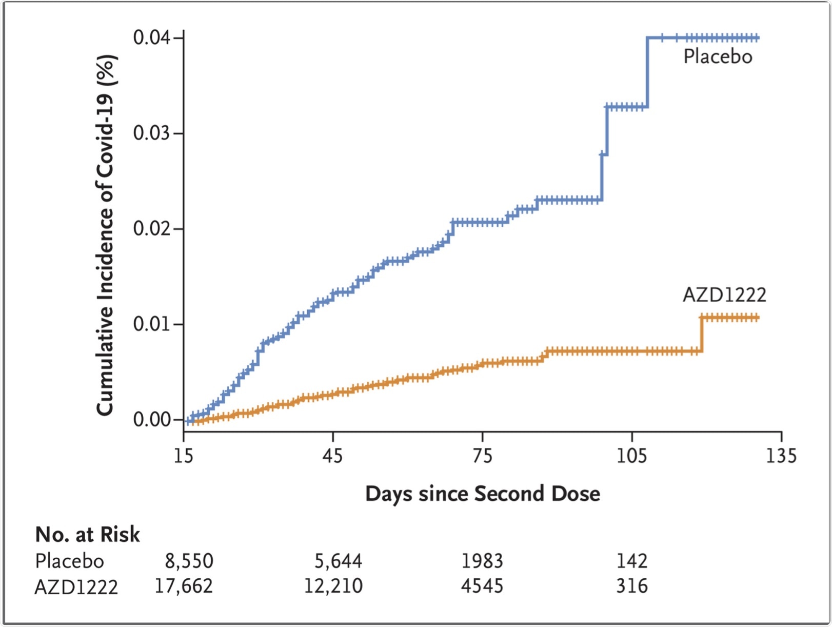 Efficacy-wise, the vaccine prevented symptomatic COVID-19. There were 73 cases in the vaccinated group, or 0.4% of the total, compared to 130 in the placebo group, or 1.5%. Taken together, vaccine efficacy was thus estimated to be 74%. The protective effect began soon after the second dose.