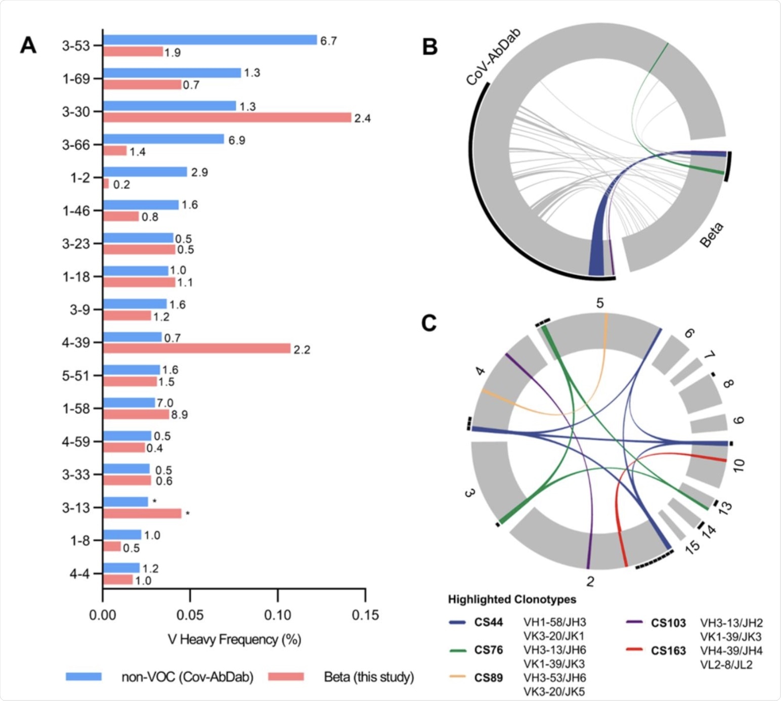 The authors of the current study, posted to the bioRxiv* preprint server, isolated CD19+CD27+ memory B-cells from 12 participants who had SARS-CoV-2 Beta variant infections to investigate the difference in reactivity between RBD Beta and non-VOC RBD on the level of monoclonal antibodies (mAbs). When compared to mAbs from non-infected individuals, sequence analysis from the participants revealed enrichment of certain VH genes, such as VH1-58, VH3-30, VH4-39, and VH3-53, which shows preferential recruitment of VH genes.