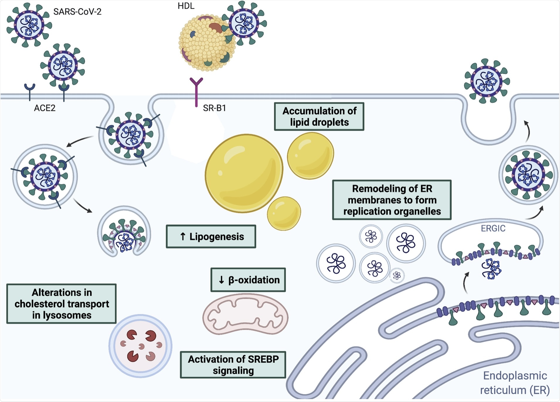 This virus also binds cholesterol within high-density lipoprotein (HDL) particles. To this end, the HDL uptake by the HDL receptor scavenger receptor B type 1 (SR-B1) causes increased viral entry in ACE2-positive cells.