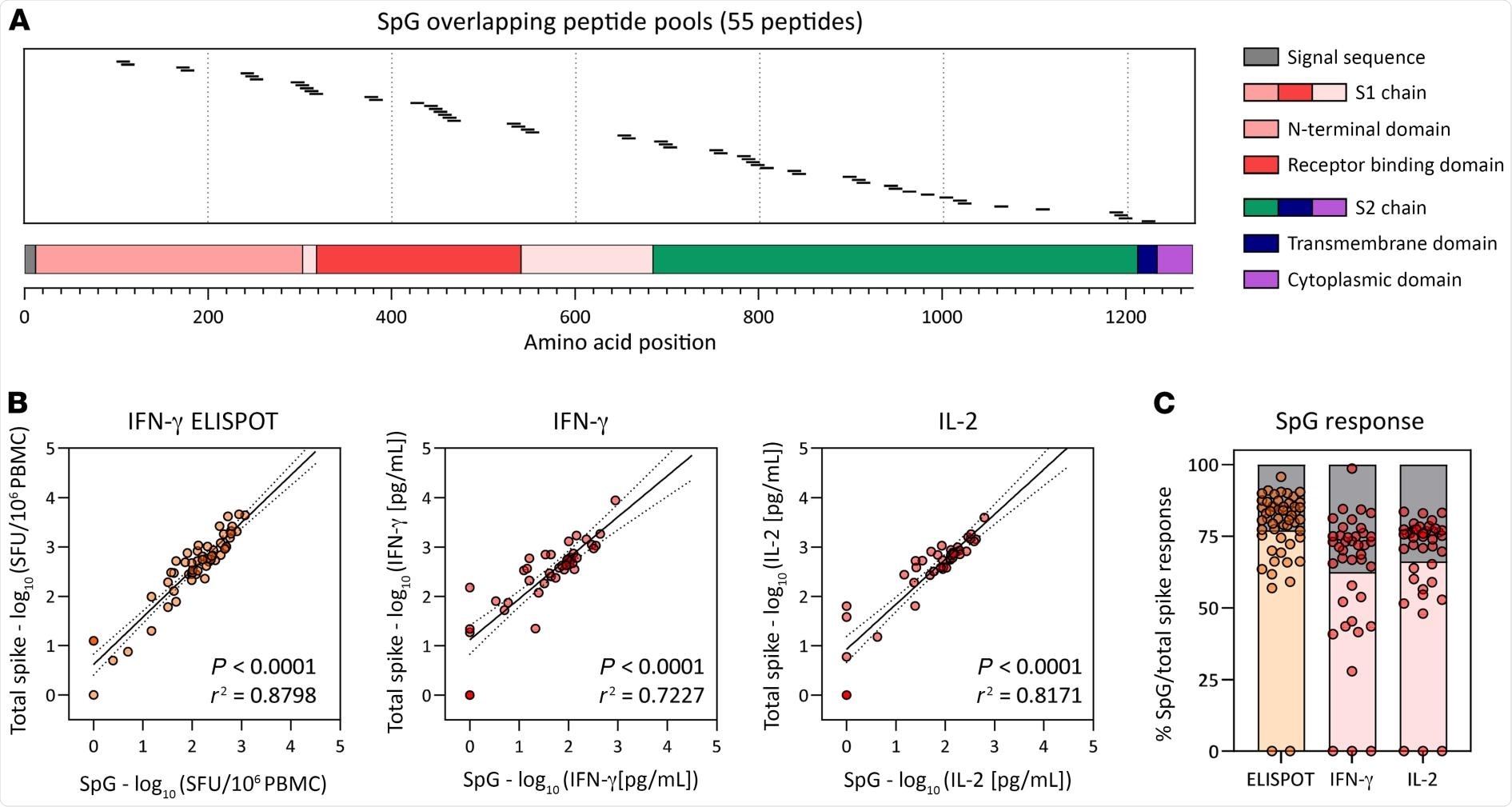 Comparatively, the assessment of the response in large numbers of individuals required a more streamlined approach. Thus, the authors examined the relationship between the total spike-specific T-cell response and the response to their selected SpG peptide pool.