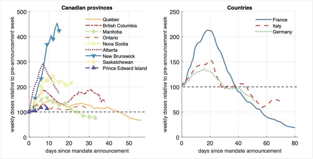 The largest gains in vaccination were observed in Alberta, Ontario, and British Columbia. For countries, the additional first doses after the announcement were found to be large in France and Italy, whereas its impact was rather small in Germany.