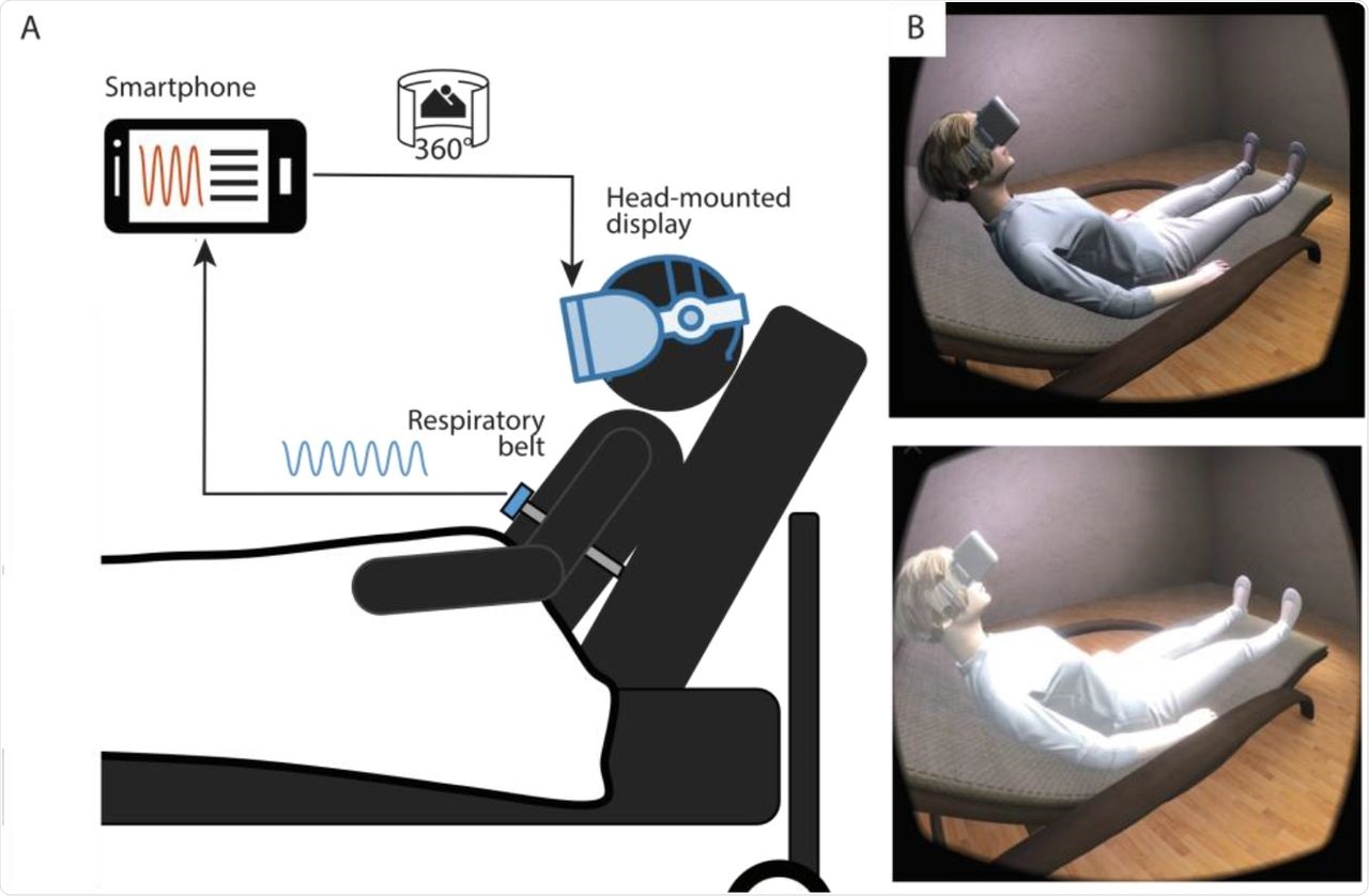 Patients were in a semi-seated position in their hospital bed and wore a respiration belt fitted on the abdomen that recorded respiratory movements. They also wore a head-mounted display that held a VR-compatible smartphone.