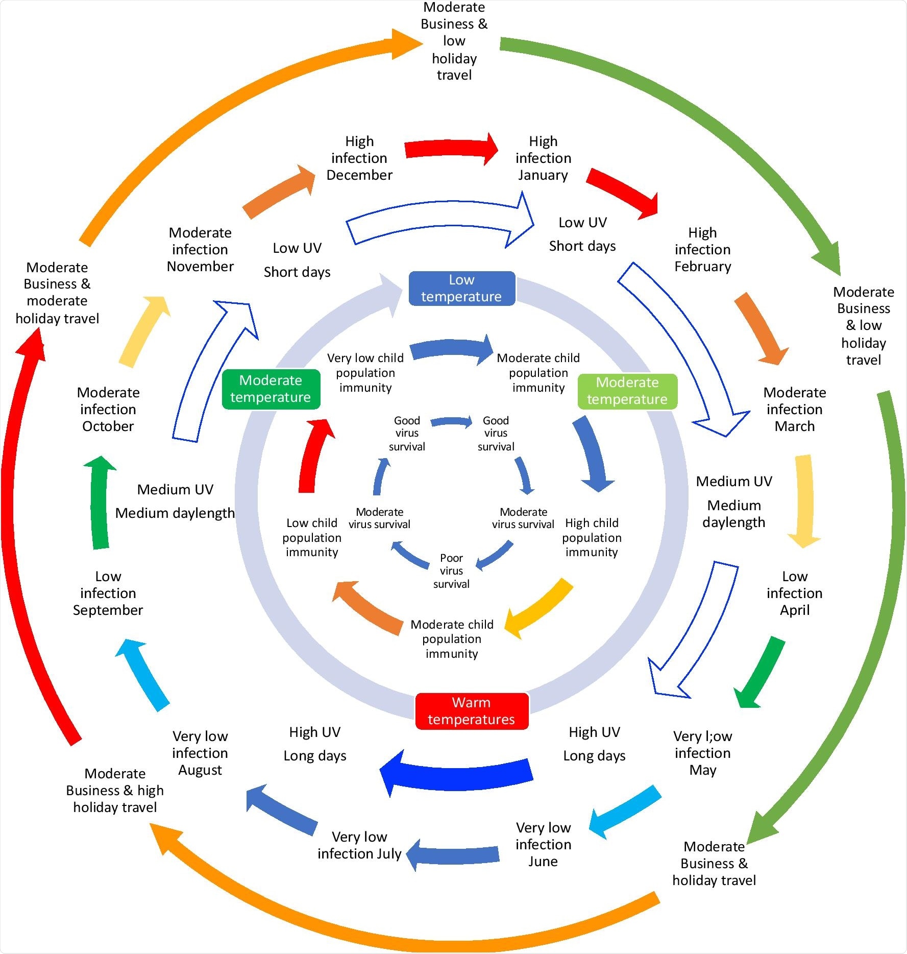 Survival of the virus in winter months is better due to low temperature, low relative humidity indoors, short day length, and low UV. This leads to a viral epidemic in the winter months.