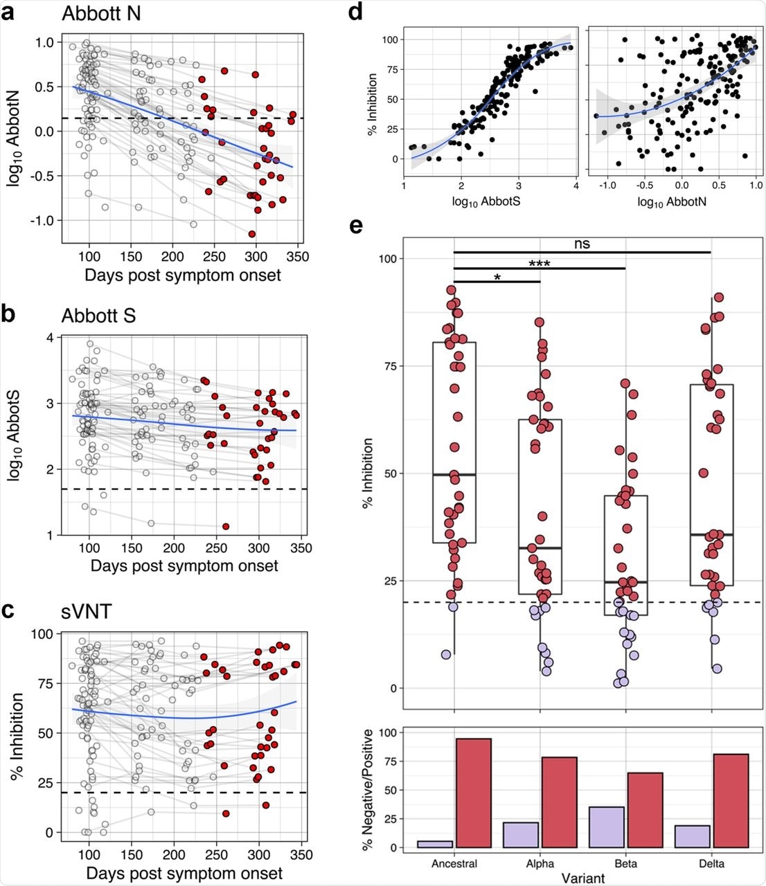 Antibody responses following SARS-CoV-2 infection over time| Antibody responses targeting Nucleocapsid (N) protein (a), Spike (S) protein (b) as well as neutralizing antibodies (c) over time. New donations are indicated by red circles with previously reported donations indicated by unfilled circles (n=172). (d) Correlation between S protein antibodies (left) and N protein antibodies (right) vs neutralizing antibodies. LOESS regression (blue line) was used to visualize general trends in antibody levels, and standard error of regression is indicated by grey shaded area (n=172). (e) Neutralizing antibody responses to variants of concern including only the latest donations (represented by red circles in a-c) (top). Kruskal- Wallis test showed a significant difference (p<0.001) with follow up Wilcoxen test Holm adjusted p-values indicated by stars, *p<0.05, ***p<0.001 (n=37). Percentage of samples below (purple) and above (pink) the assay cut-off (bottom). Dashed horizontal lines represent respective test cut-offs throughout.