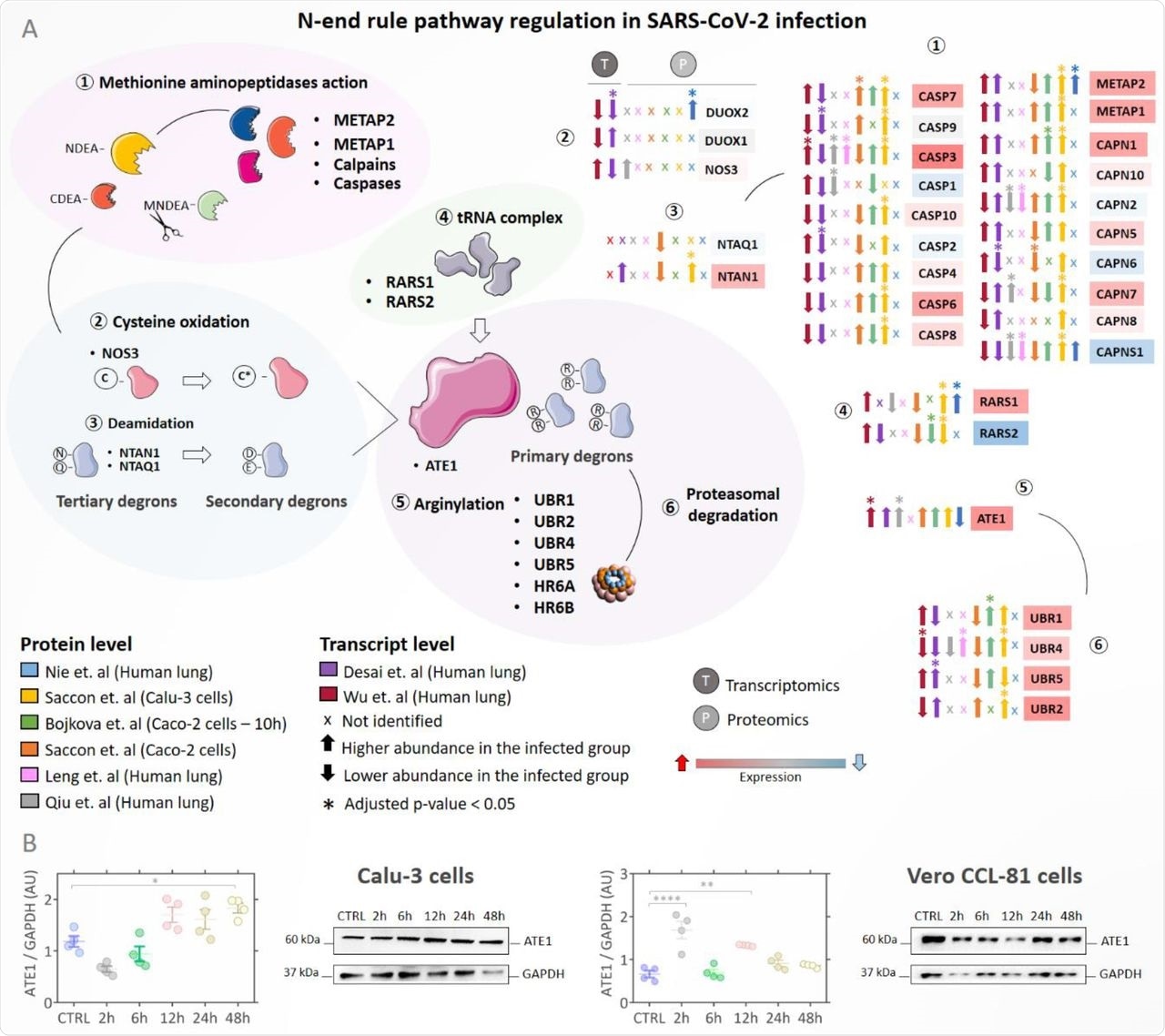 The authors of the current study performed an in silico reanalysis of in vivo and in vitro public omics data to verify the abundance of proteins that make up the N-end rule pathway in non-infected and SARS-CoV-2 infected groups or other viral infections. This was combined with western blotting to measure the levels of arginyl-transfer RNA (tRNA)-protein transferase (ATE1) and arginylated proteins.