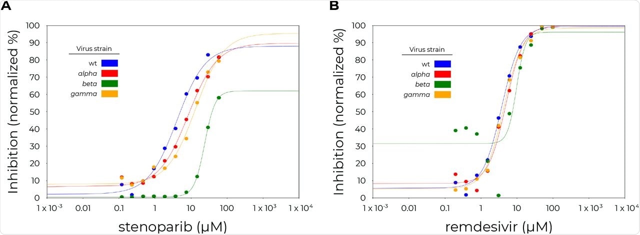 Stenoparib inhibited virus replication in a dose-dependent manner across all four tested strains of SARS-CoV-2. Interestingly, a higher concentration of stenoparib was required to inhibit the Beta variant, even when used in combination with remdesivir. This may be because the Beta variant replicates rapidly and has a reduced time period between infection and the appearance of the mature virus within the cell.