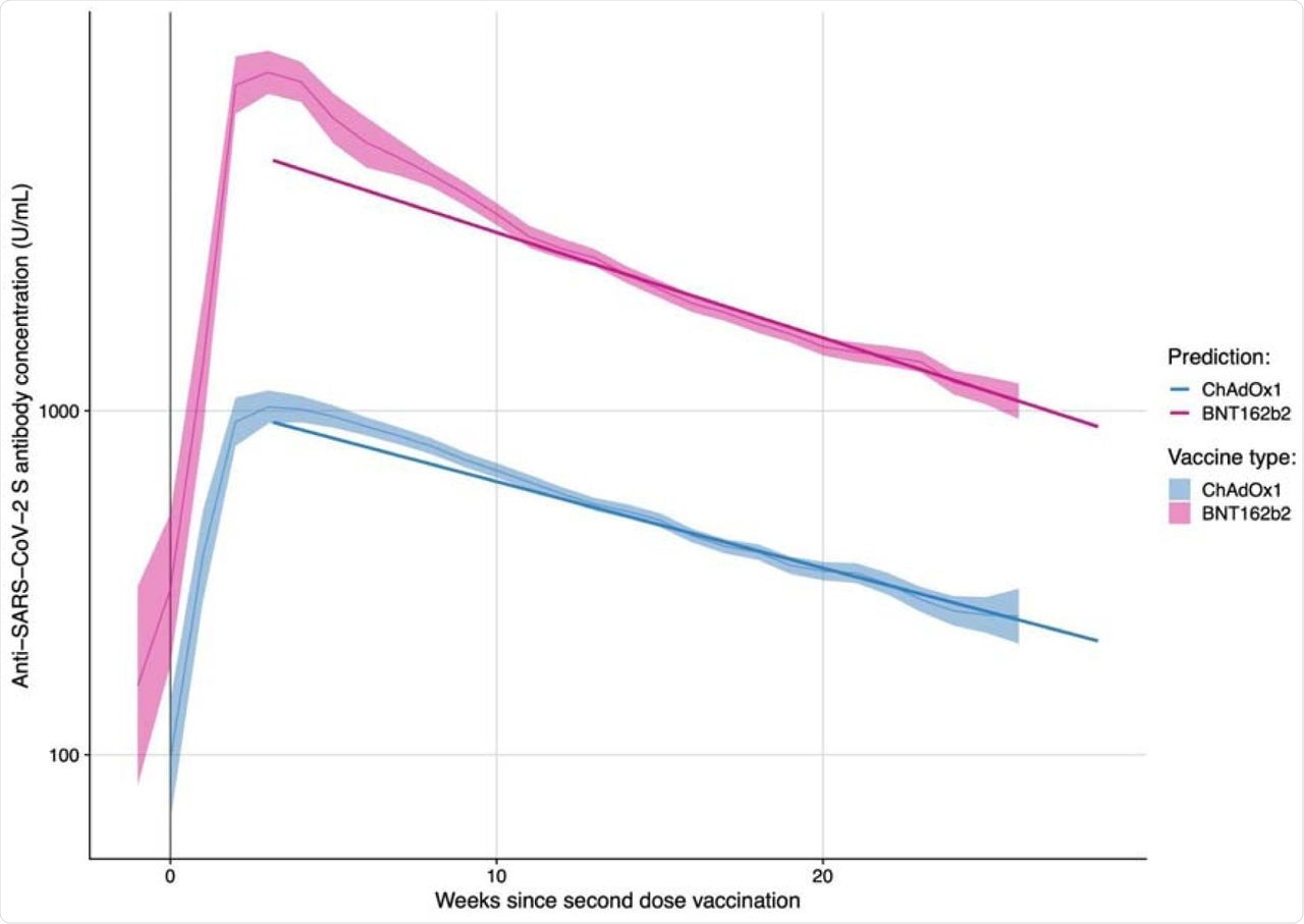 At 20 weeks after the second dose of the vaccine, mean anti-S levels were 1521 U/ml for BNT162b2 and 342U/ml for ChadOx1 recipients. However, the overall rates of waning were higher in BNT162b2 recipients as compared to those who had received the ChAdOx1 vaccine.