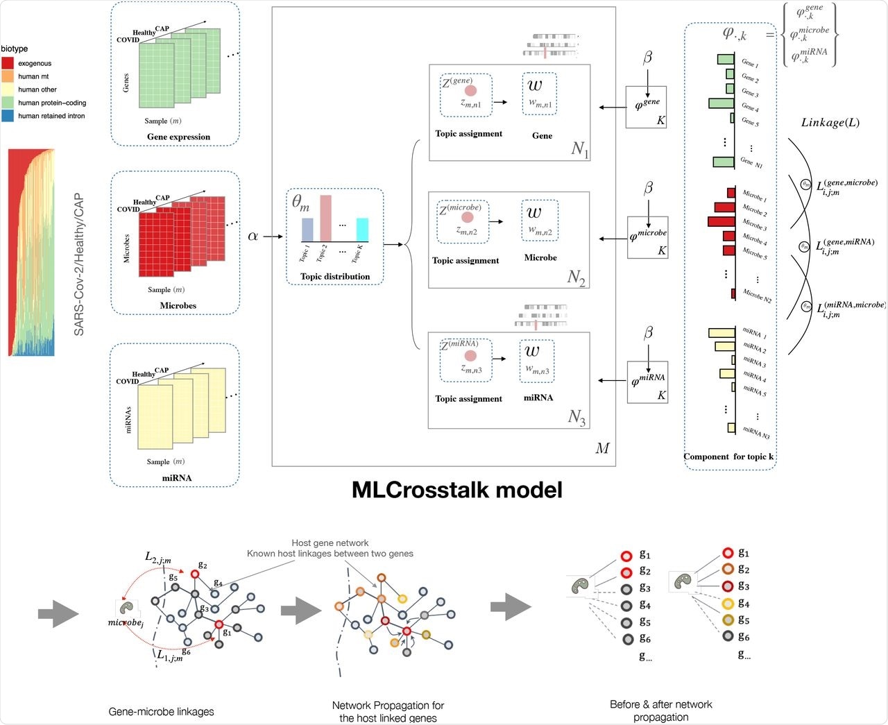 The researchers also implemented a secondary refinement with network propagation to enable the microbe-gene linkages to focus on larger network structures. They first evaluated the trained model by analyzing the clustering of sample topic distributions. The model groups individuals with the coronavirus disease 2019 (COVID-19), healthy individuals, and those with community-acquired pneumonia (CAP) into distinct clusters.