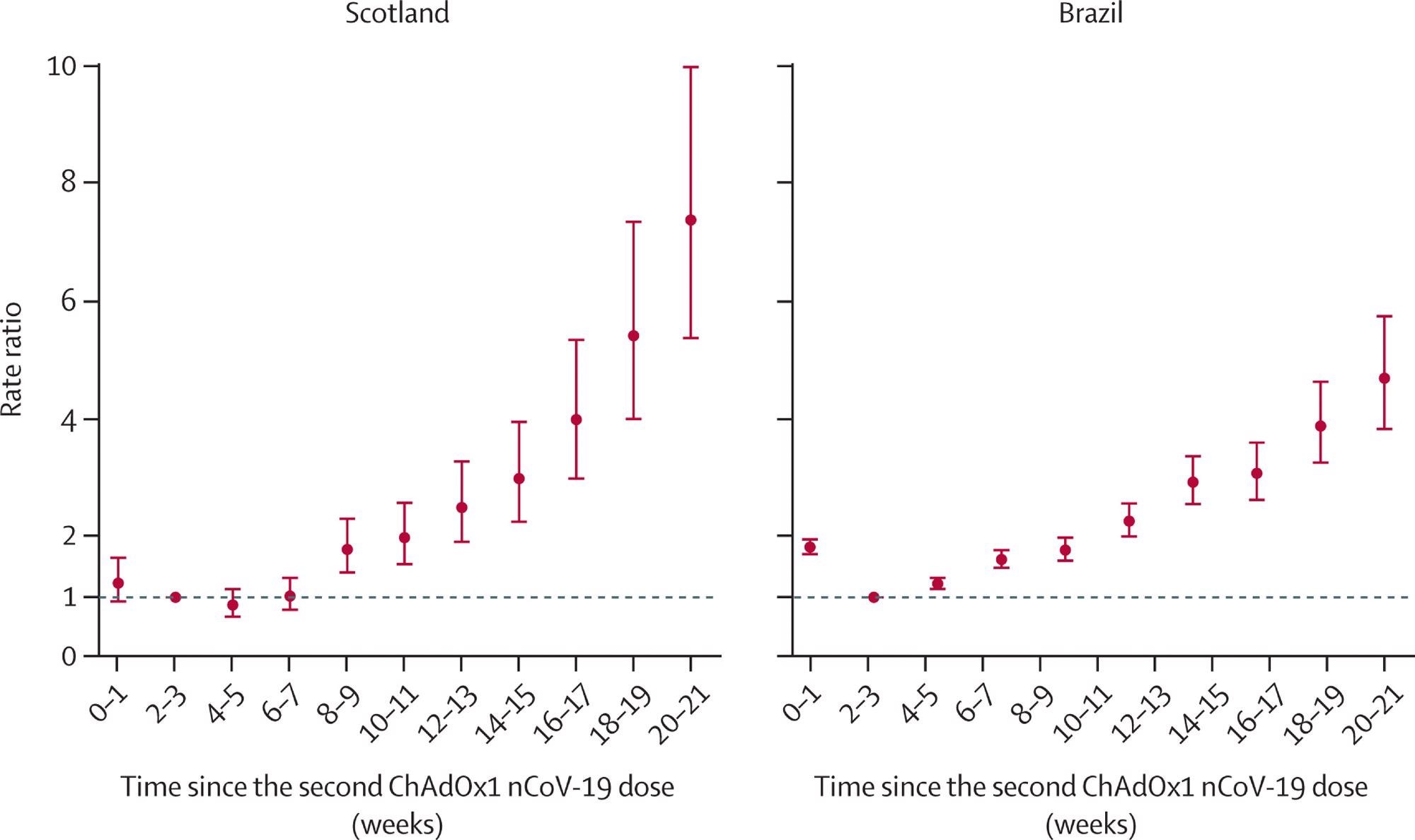 The relative risks for severe disease increased with time in fully vaccinated individuals in both countries. In Scotland, serious infection rates at 2-3 weeks from the second dose of vaccine doubled at 10-11 weeks and tripled at 14-15 weeks. At 18-19 weeks, the rates went up five-fold. Similar patterns were seen in Brazil. This clearly shows waning immunity.