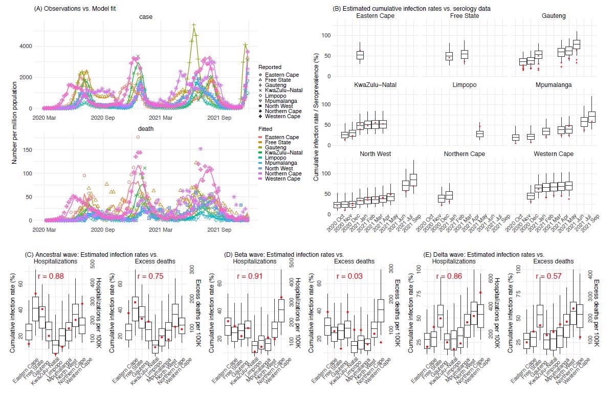 The model-estimated cumulative infection rates were higher than the province-based seroprevalence measures obtained at various time points. They correlated well with the COVID-19-associated hospitalization data from the ancestral SARS-CoV-2, Beta, and Delta variants across the nine South African provinces. The estimated infection numbers also correlated with the age-adjusted excess mortality associated with the SARS-COV-2 ancestral and Delta wave; however, they did not correlate with the SARS-COV-2 Beta wave.