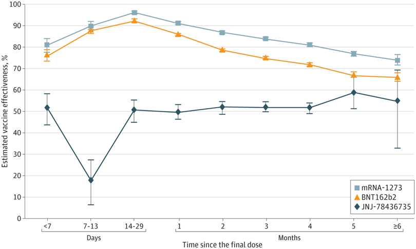 Models were adjusted for age, geographic region, and calendar month of test. Estimated vaccine effectiveness over time since the final dose was calculated as (1 − multivariable-adjusted odds ratio for infection) × 100. The final dose was defined as the only dose for JNJ-78436735 and the second dose for mRNA-1273 or BNT162b2 before August 7, 2021.