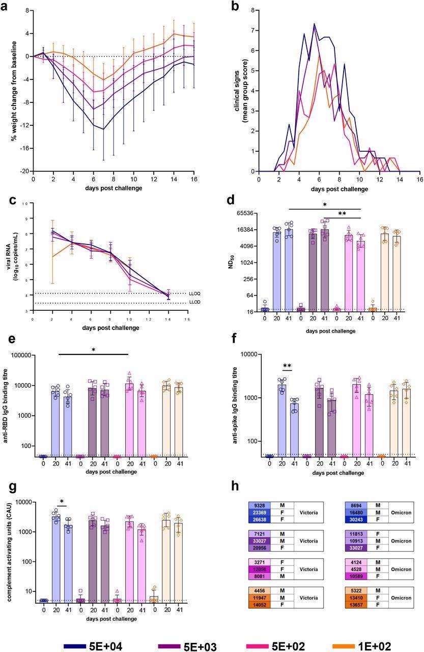 Dose-Ranging with VIC01. Hamsters were monitored for (a) weight change (lines represent group means, error bars represent standard deviation) and (b) clinical signs (lines represent group means) following challenge with VIC01. Hamsters challenged with 5E+04 lost significantly more weight overall (area under curve) than hamsters challenged with 5E+02 (P=0.0146) and 1E+02 (P=0.0058). Throat swabs were collected at days 2, 4, 6, 8 10 and 14 for all virus-challenged groups. (c) Total viral RNA was quantified by RT-qPCR at all sample time points. Lines show group geometric means, error bars represent standard deviation. The dashed horizontal lines show the lower limit of quantification (LLOQ) and the lower limit of detection (LLOD). Hamsters underwent gingival bleeds for sera at baseline, 20 and 41 days post-challenge for assessment of the humoral response. (d) Neutralizing antibody titers, (e) SARS-CoV-2 RBD-specific IgG binding antibodies, (f) SARS-CoV-2 spike-specific IgG binding antibodies and (g) SARS-CoV-2 spike-specific antibody-dependent complement deposition were assessed in challenged hamsters at baseline, day 20 and day 41 post-challenge. Bars represent group means and error bars represent standard deviation. All statistical analysis between groups was carried out using one-way ANOVA with Tukey’s correction. The dashed horizontal lines represent the lower limit of quantification (LLOQ) of the assays. (h) At 50 days post-challenge hamsters, each dose group was split into three and re-challenged with either VIC01 or Omicron. Numbers neutralizing antibodies (ND50) titers at day 41 post-challenge. Males and females were split equally between the VIC01 and Omicron re-challenge groups. Groups are identified according to their ‘target’ dose.