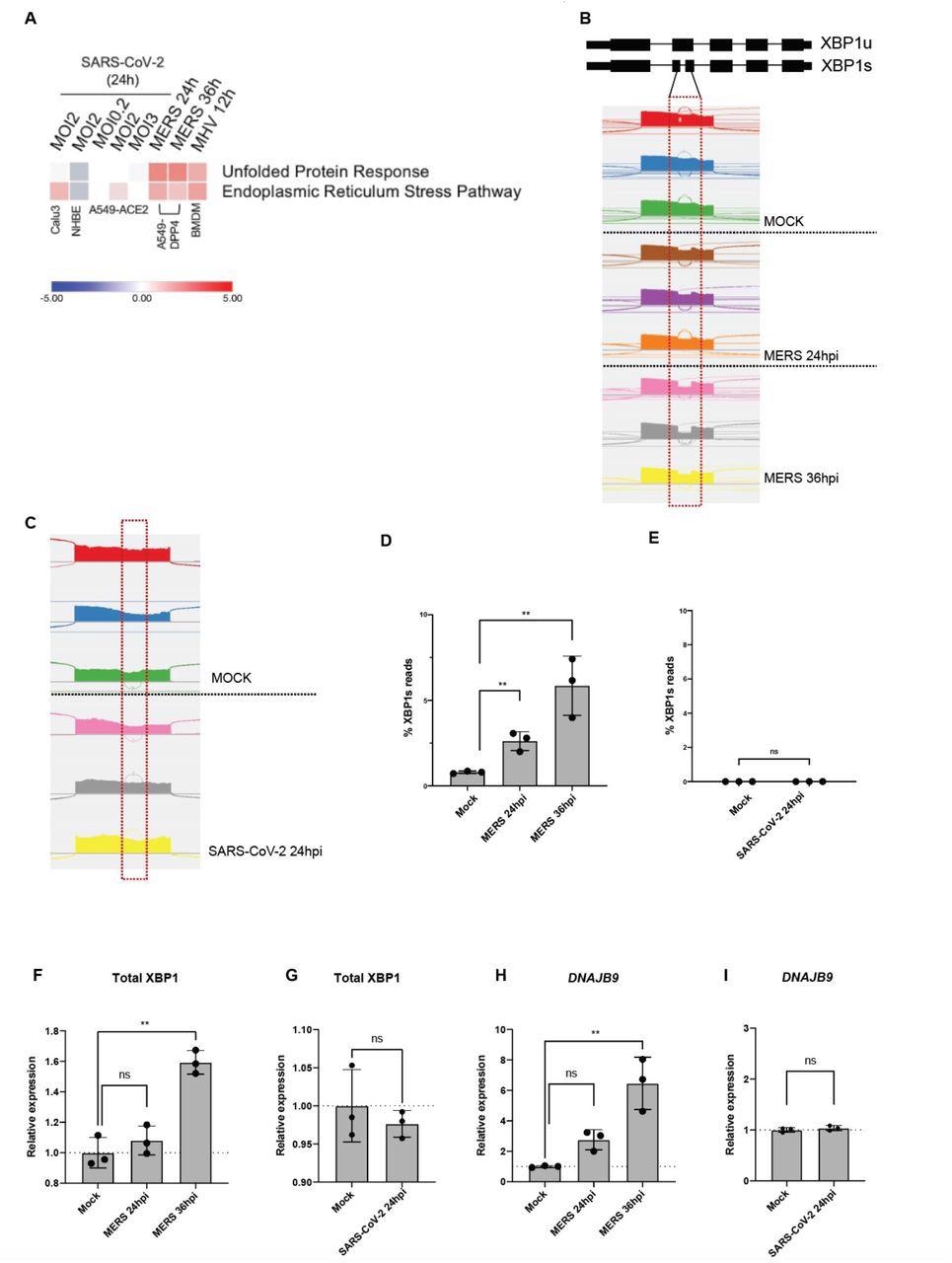 The authors observed that the four beta CoVs of HCoV-OC43, MERS-CoV, SARS-CoV-2, and MHV activate the IRE1α in host cells following infection. It was noted that except for SARS-CoV-2, the other CoVs induced splicing of XBP1 mRNA.