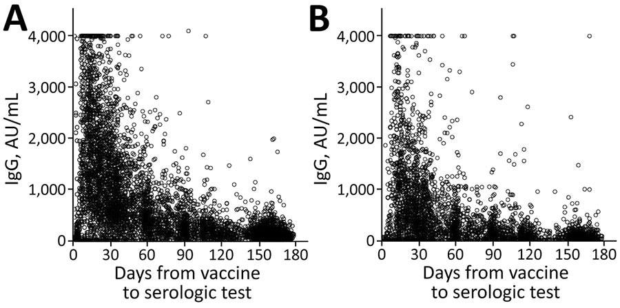 IgG levels for population vaccinated with mRNA BNT162b2 vaccine (Pfizer-BioNTech, https://www.pfizer.com) against coronavirus disease over time, by age group, Maccabi Healthcare Services, Israel, January‒June 2021. A) <60 years of age. B) >60 years of age.