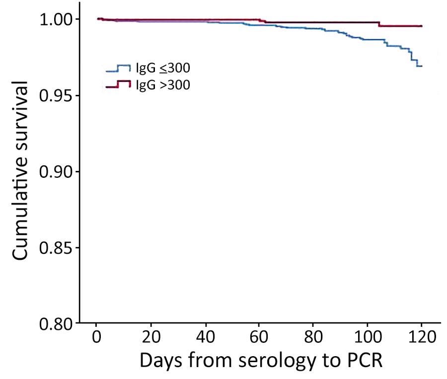 As a result, those who had previously been infected were less likely to have a serologic level of 300 AU/mL. However, 0.8% of those tested had a PCR positive result, regardless of a previous infection.