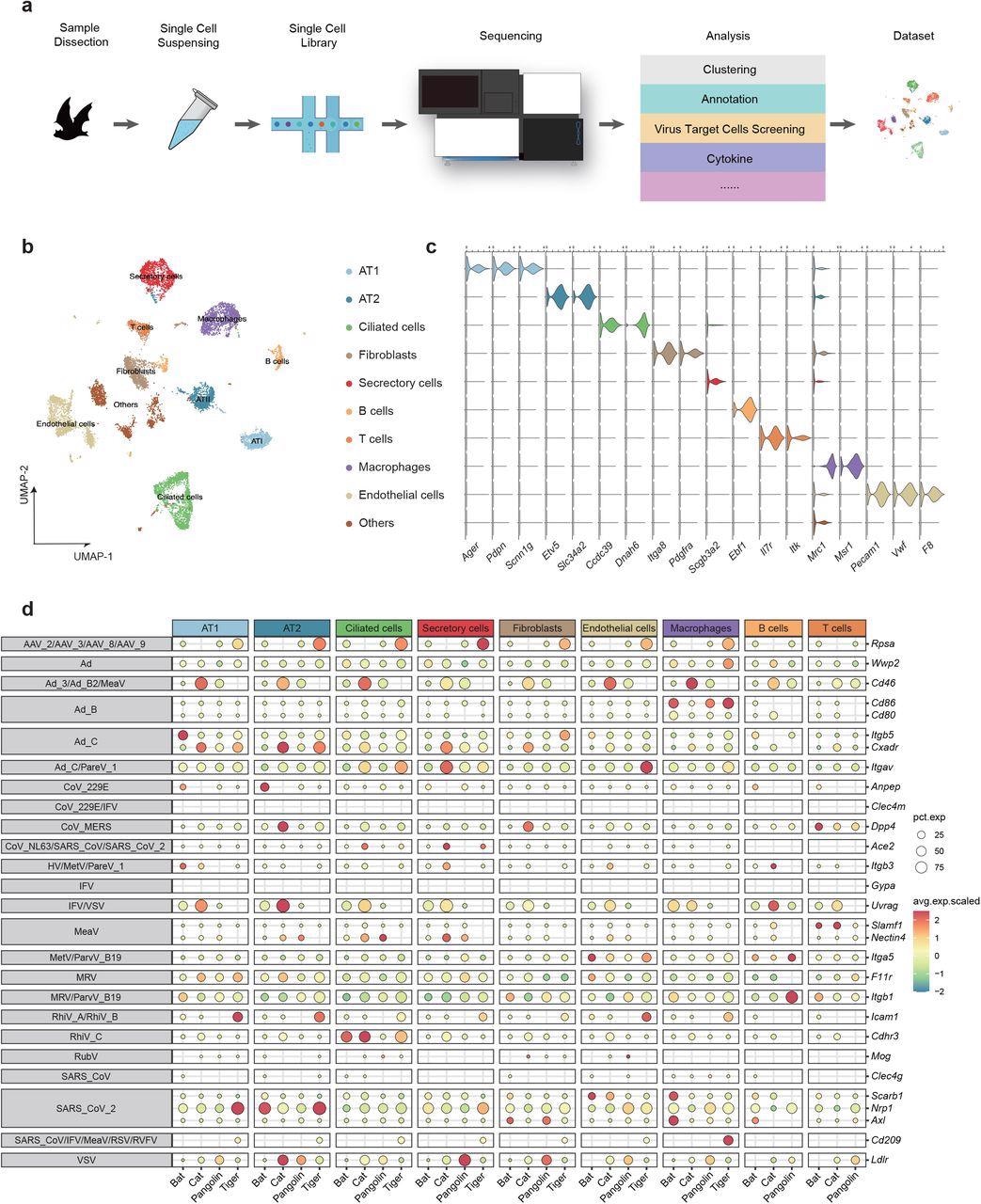 Comparative single-cell lung atlas of the bat, cat, tiger and pangolin. a, Illustration of the overall project design. b, UMAP plot of bat lung. c. Violin plot showing the expression patterns of canonical cell type markers. d. Expression proportion and scaled expression value of virus receptors in distinct cell types of bat, cat, tiger and pangolin.