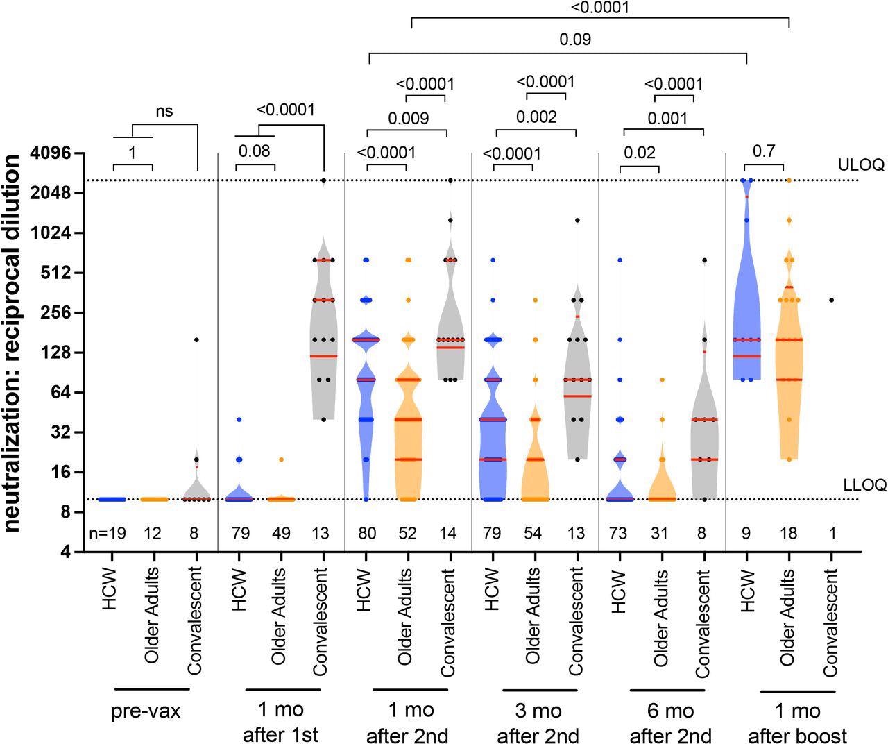 Longitudinal live virus neutralization activity in plasma following one, two and three COVID-19 vaccine doses. Viral neutralization activities, defined as the lowest reciprocal plasma dilution at which neutralization was observed in all triplicate assay wells, in HCW (blue circles) and older adults (orange circles) who were COVID-19 naive at study entry, as well as COVID-19 convalescent participants (black circles) at six time points: prior to vaccination, one month following the first dose, one, three and six months following the second vaccine dose, and one month following the third or booster vaccine dose. Plasma samples showing neutralization in fewer than three wells at a 1/20 dilution were coded as having a reciprocal dilution of 10, corresponding to the lower limit of quantification (LLOQ) in this assay. The highest dilution tested was 1/2560, which corresponds to the upper limit of quantification (ULOQ) in this assay. The numbers of participants analyzed are indicated at the bottom of the plot; note that only a subset of pre-vaccine plasma samples was assayed for this activity. Red bars and whiskers represent the median and IQR. P-values were computed using the Mann-Whitney U-test (for comparisons between groups) or the Wilcoxon matched-pairs test (for comparisons across time points within a group) and are uncorrected for multiple comparisons.