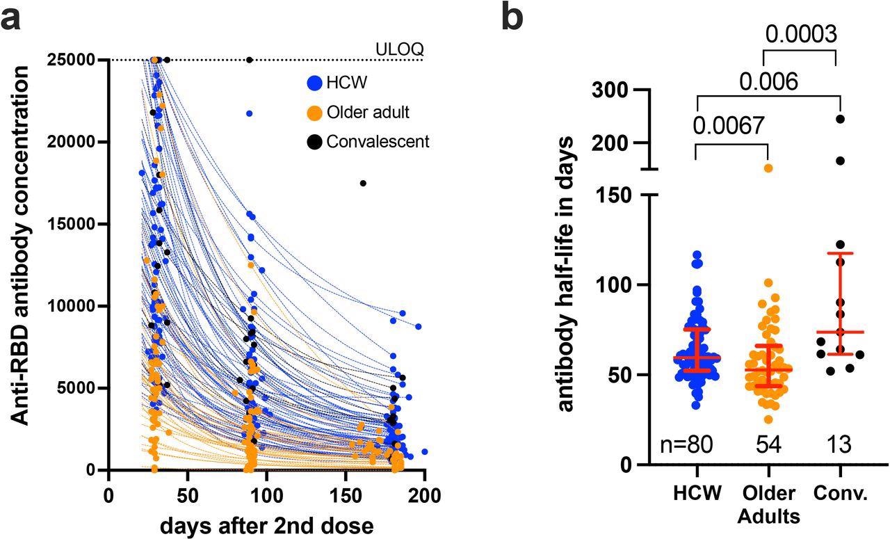 Decay rates and half-lives of serum binding antibody responses to spike RBD following two COVID-19 vaccine doses. Panel A: Temporal declines in serum binding antibody responses to spike-RBD following two COVID-19 vaccine doses in HCW (blue) and older adults (orange) who were COVID-19 naive at study entry, as well as COVID-19 convalescent participants (black circles). ULOQ: upper limit of quantification. Panel B: Binding antibody half-lives following two COVID-19 vaccine doses, calculated by fitting an exponential curve to each participant’s available longitudinal measurements shown in panel A. The numbers of participants analyzed are indicated at the bottom of the plot. Red bars and whiskers represent the median and IQR. P-values were computed using the Mann-Whitney U-test and are uncorrected for multiple comparisons.