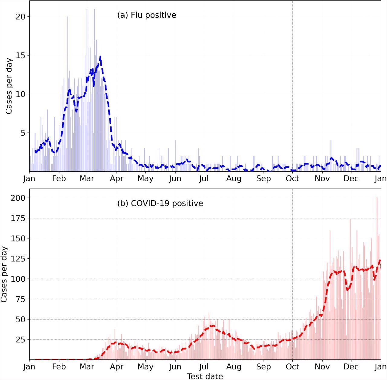 Incidence of Flu (top) and COVID-19 (bottom) in the year 2020, from the Fitbit COVID-19 survey.