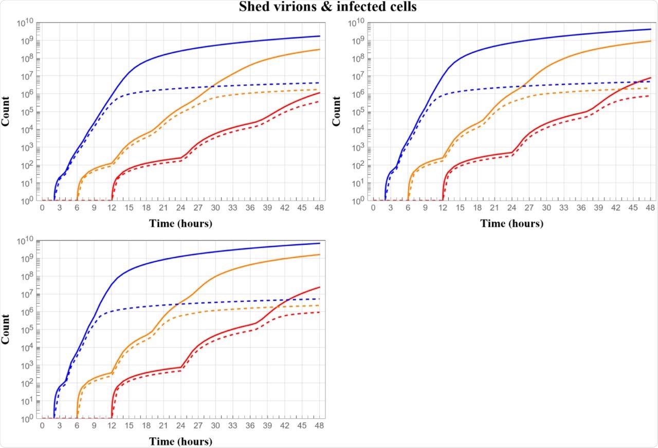 The researchers then reduced the latency time from their prior experiment, which had a duration of 12 hours, to two hours, followed by allowing the model to run for two consecutive days. To this end, a significant increase in the number of infected cells exiting the eclipse phase, as well as a rise in the shedding of infectious virions was observed.