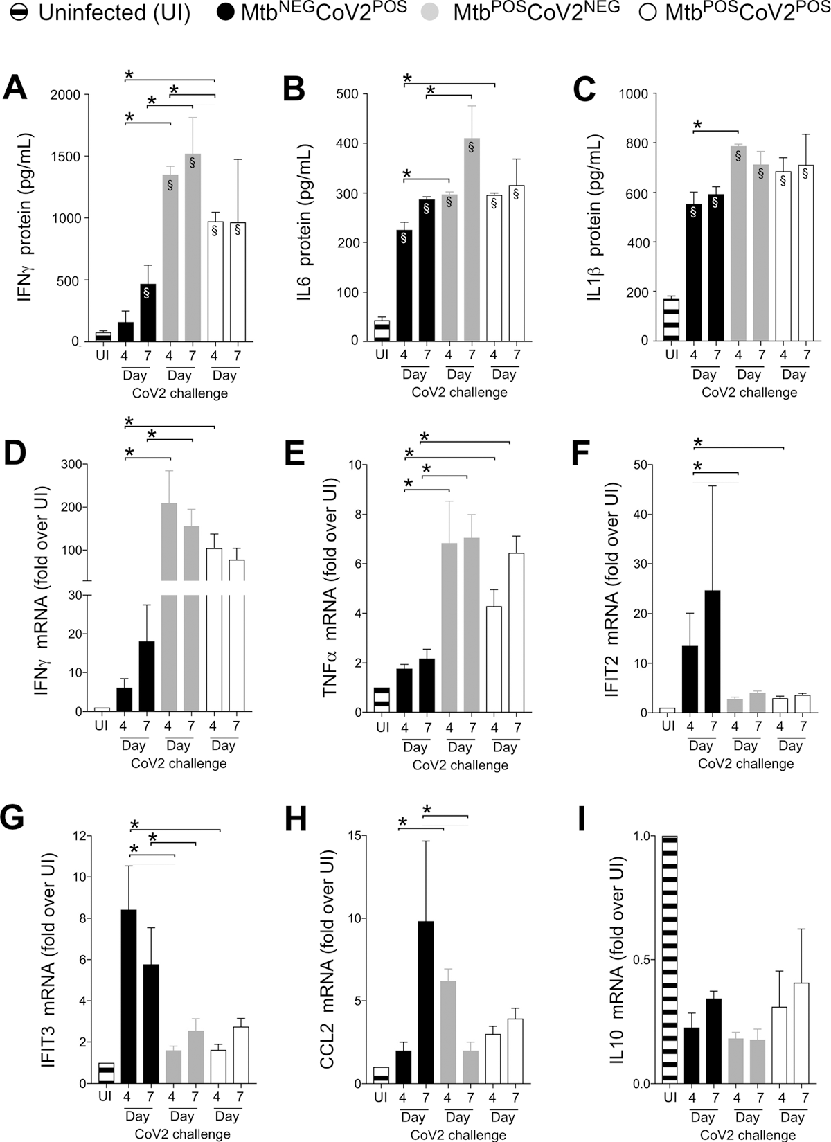CoV2-elicted cytokine responses are muted in the presence of Mtb infection. On the indicated days, lung tissue from MtbNEGCoV2POS, MtbPOSCoV2NEG, MtbPOSCoV2POS and uninfected (UI) ACE2 mice was used to measure (A-C) protein levels of (A) IFNγ, (B) IL6 and (C) IL1β, as well as (D-I) mRNA levels of (D) IFNγ, (E) TNFα, (F) IFIT2, (G) IFIT3, (H) CCL2 and (I) IL10. This experiment was repeated twice, each with similar results (4 mice/group/timepoint). *, p ≤ 0.05 as determined by either Student’s t-test or ANOVA; §, significant relative to UI protein levels.