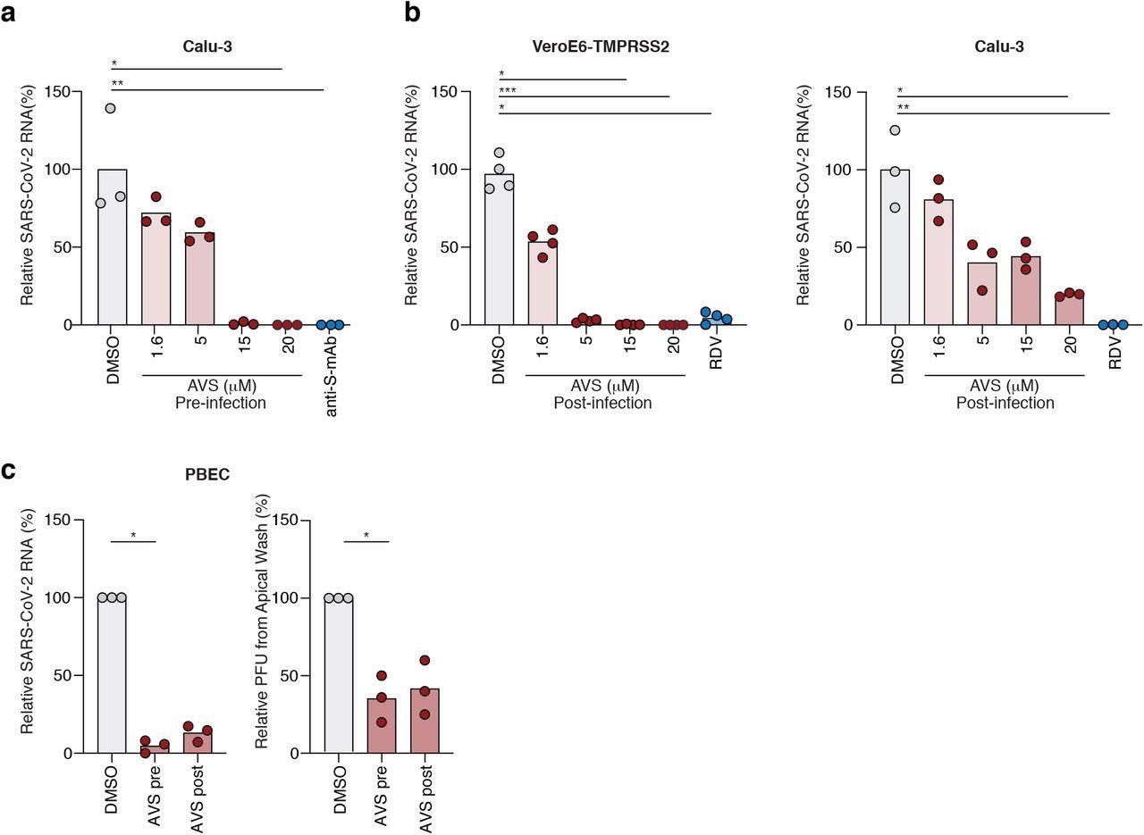 Calu-3 cells pretreated with AVS were infected with (authentic) SARS-CoV-2, which resulted in a significant decrease of intracellular viral ribonucleic acid (RNA). Further, Calu-3 or Vero-E6-TMPRSS2 cells were treated with AVS post-infection with the authentic virus, thus demonstrating a decline in SARS-CoV-2 ribonucleic acid (RNA). Inhibition of viral infection in both cell lines by AVS was comparable to that of the antiviral remdesivir.