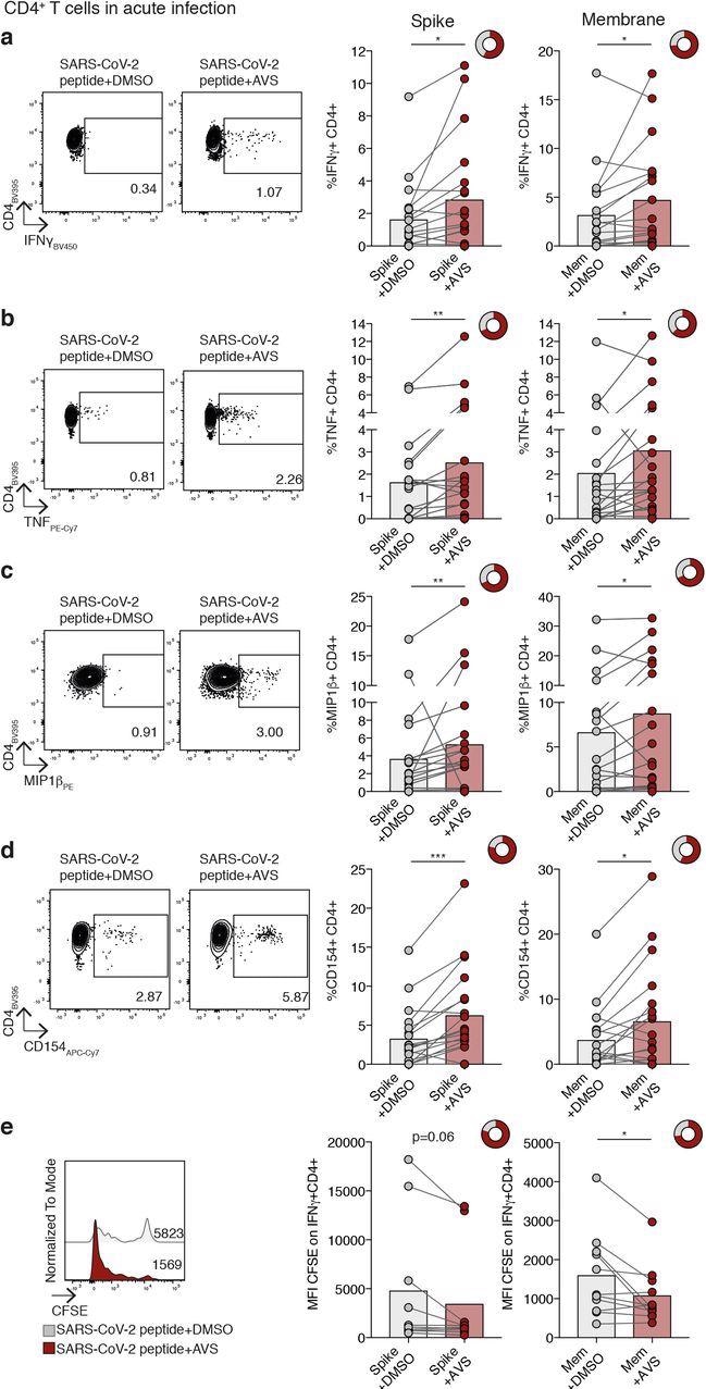 Impact of Avasimibe on SARS-CoV-2-specific CD4+ T cells in acute infection. (a-e) Human PBMC from donors with acute SARS-CoV-2 infection were stimulated with SARS-CoV-2 peptide pools (Spike and Membrane, Mem) and treated with Avasimibe (AVS) or DMSO for 8d. SARS-CoV-2-specific cytokine production by CD4+ T cells was detected via flow cytometry. The cytokine production/CD154 expression in wells without peptide stimulation was subtracted to determine SARS-CoV-2-specific cytokine production/CD154 expression in summary data. Example plots and summary data for SARS-CoV-2 specific IFNγ(a), TNF (b), MIP1β(c) production and CD154 expression (d) by CD4+ T cells (n=19). (e) Assessment of SARS-CoV-2-specific proliferation determined by CFSE dilution gated on IFNγ+ CD4+ T cells (Spike n=10; Mem n=11). Bars mean. Doughnut charts indicate fraction of donors with response to AVS (red). Response defined as de novo or increased cytokine production/CD154 expression. P values determined by Wilcoxon matched-pairs signed rank test.